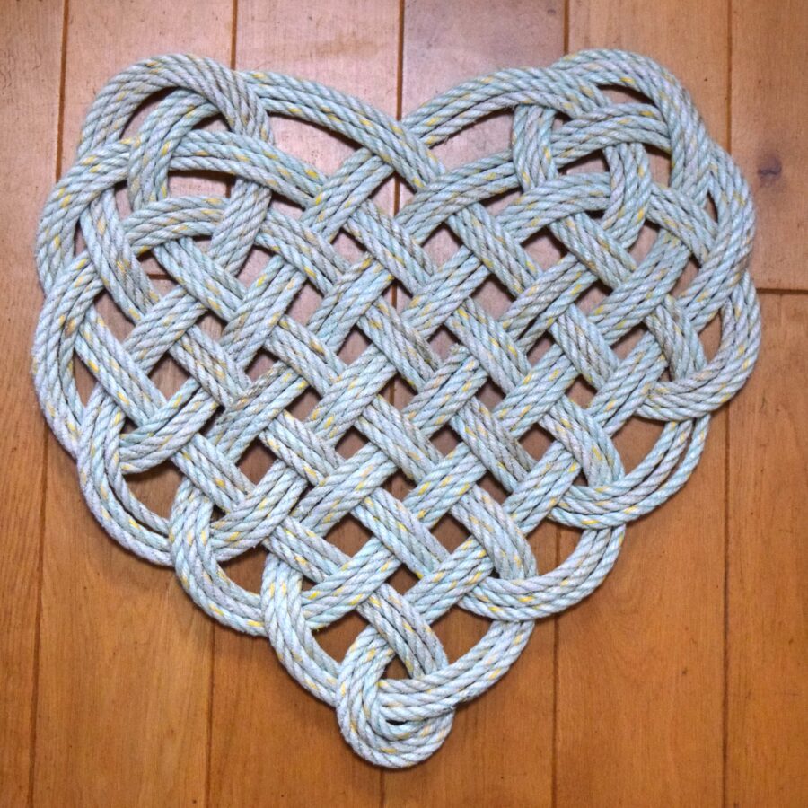 A heart-shaped mat hand-made from reclaimed rope salvaged from Orbost Beach, Isle of Skye. Turquoise with yellow fleck