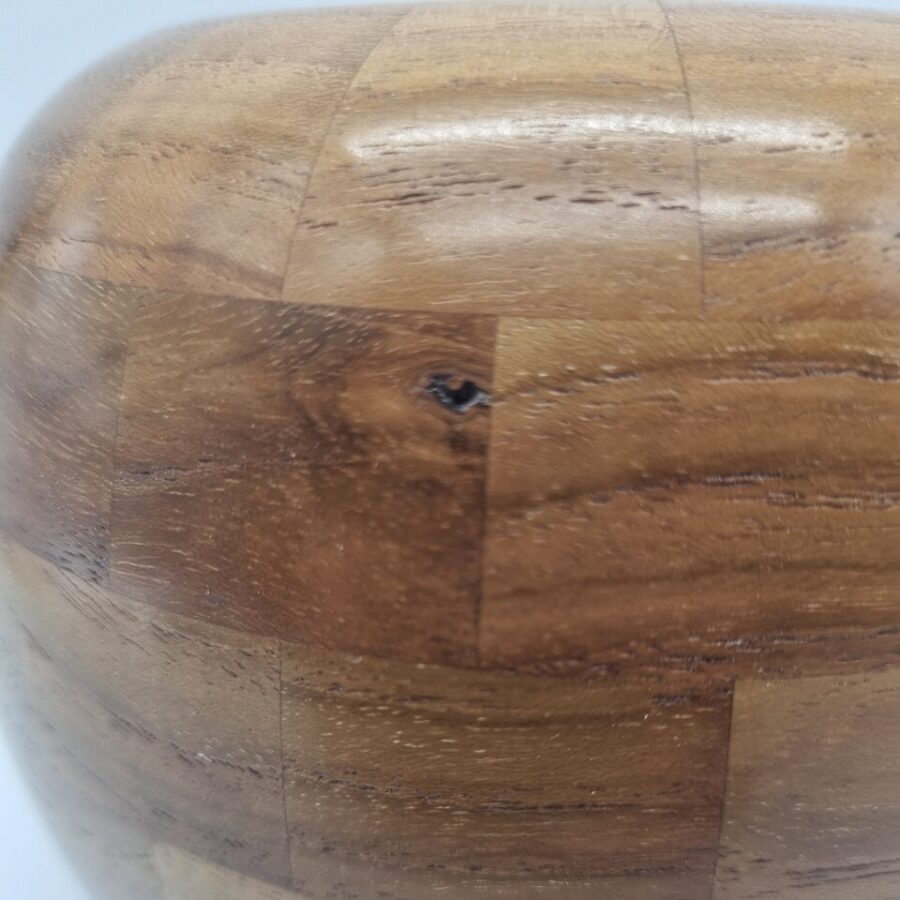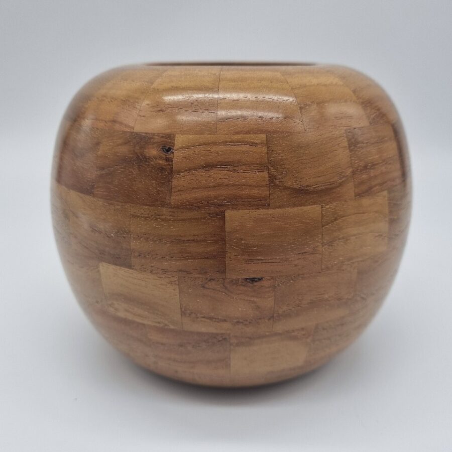 A beautiful Iroko segmented vase finished with Danish oil and then polished with wax for a deep long lasting shine.