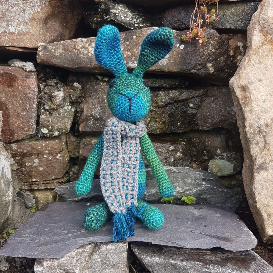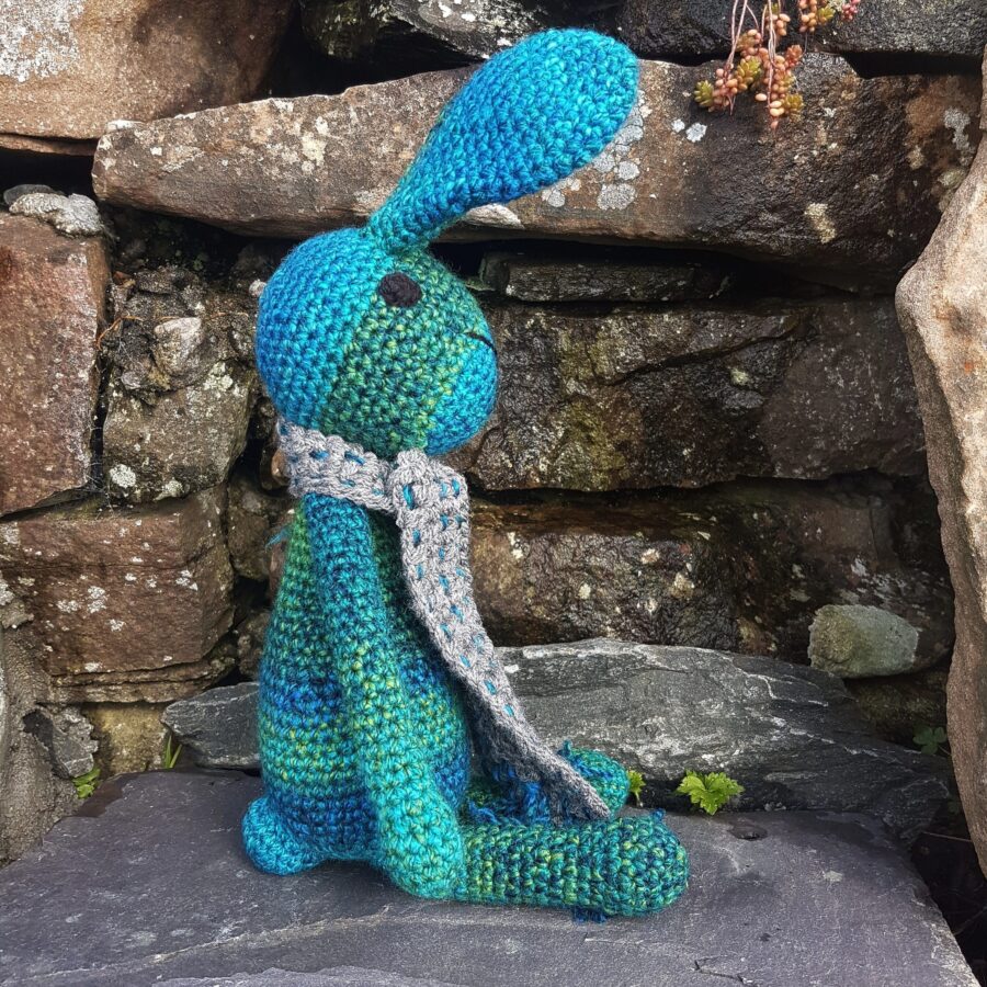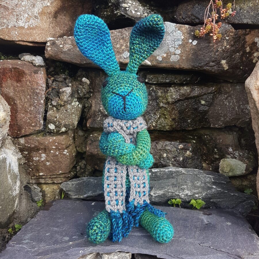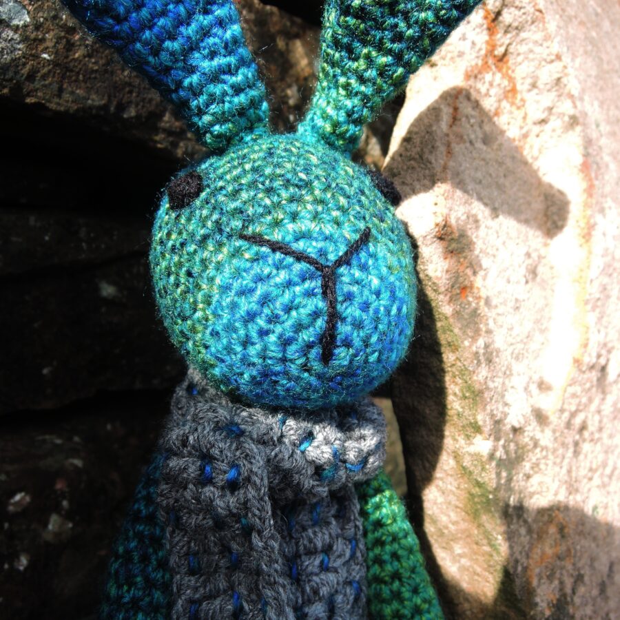 Please meet Isla of the McCoineanach clan. Coineanach means 'rabbit' in Scottish Gaelic. This clan is constantly growing. 'Isla' means 'dynamic, vibrant & bright'. Isla is crochet in a lovely variegated blue/green acrylic yarn and has crochet black eyes. She also wears a long grey scarf with blue/green fringe. Each bunny is unique in name as well as colours.