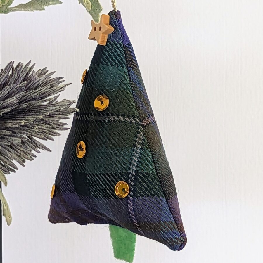 A beautifully crafted hanging Christmas decoration, handmade from genuine Isle of Skye tartan fabric. Finished with gold sequins and a cute wooden star on one side. The perfect addition to your Christmas tree!