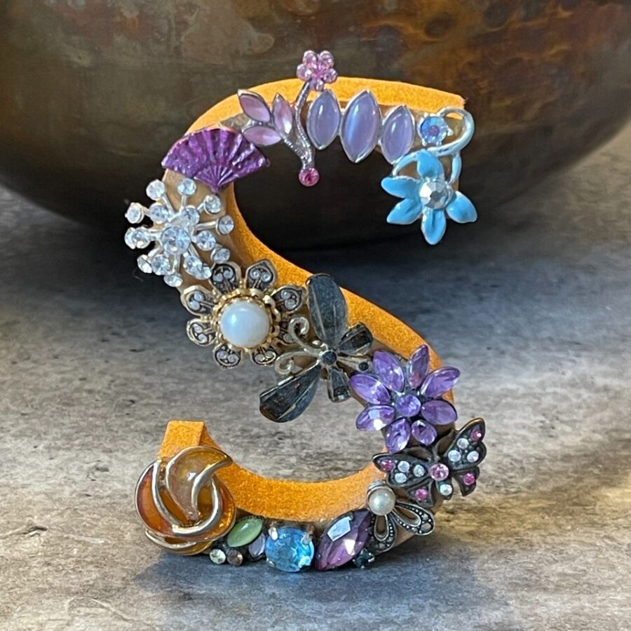A letter S jewelled ornament made from 18mm thick MDF, painted and decorated with upcycled jewels.