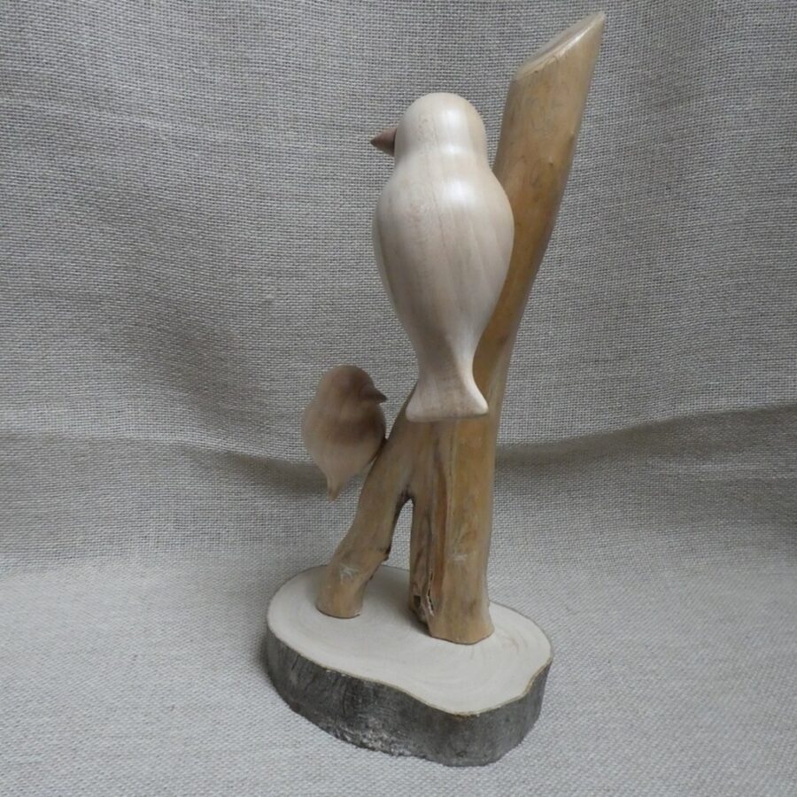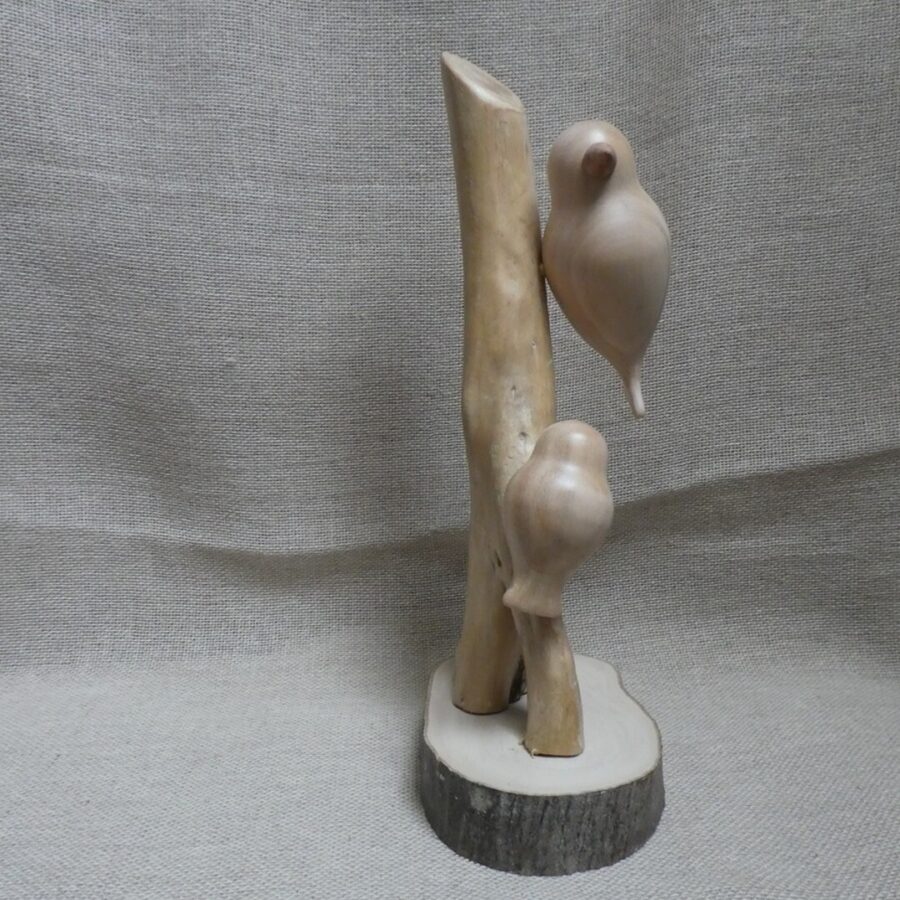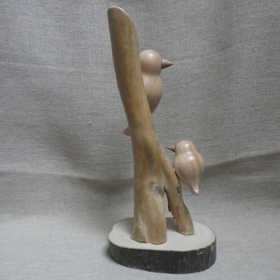 A beautiful unique hand crafted bird sculpture. The birds are made from lime wood, mounted on a piece of driftwood and a pale wood section base.