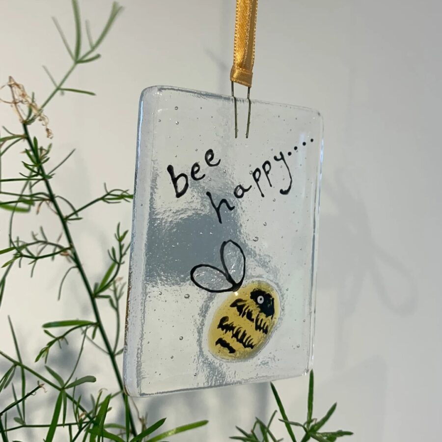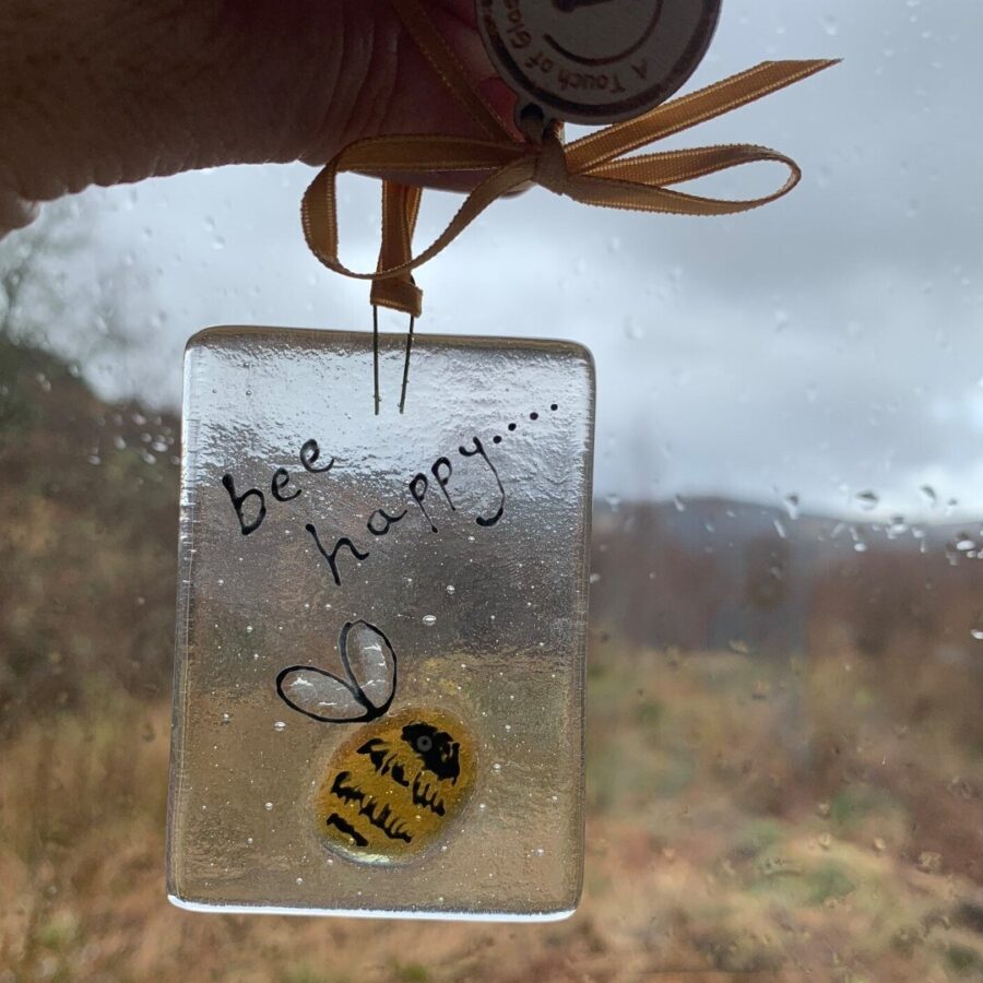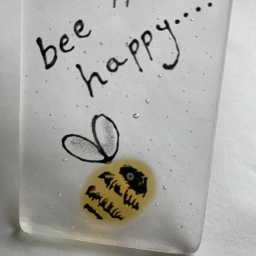 A sweet little gift token to brighten someone's day featuring a bumble bee with shimmery wings. It is made with hand cut and decorated pieces of glass that have been kiln fired.