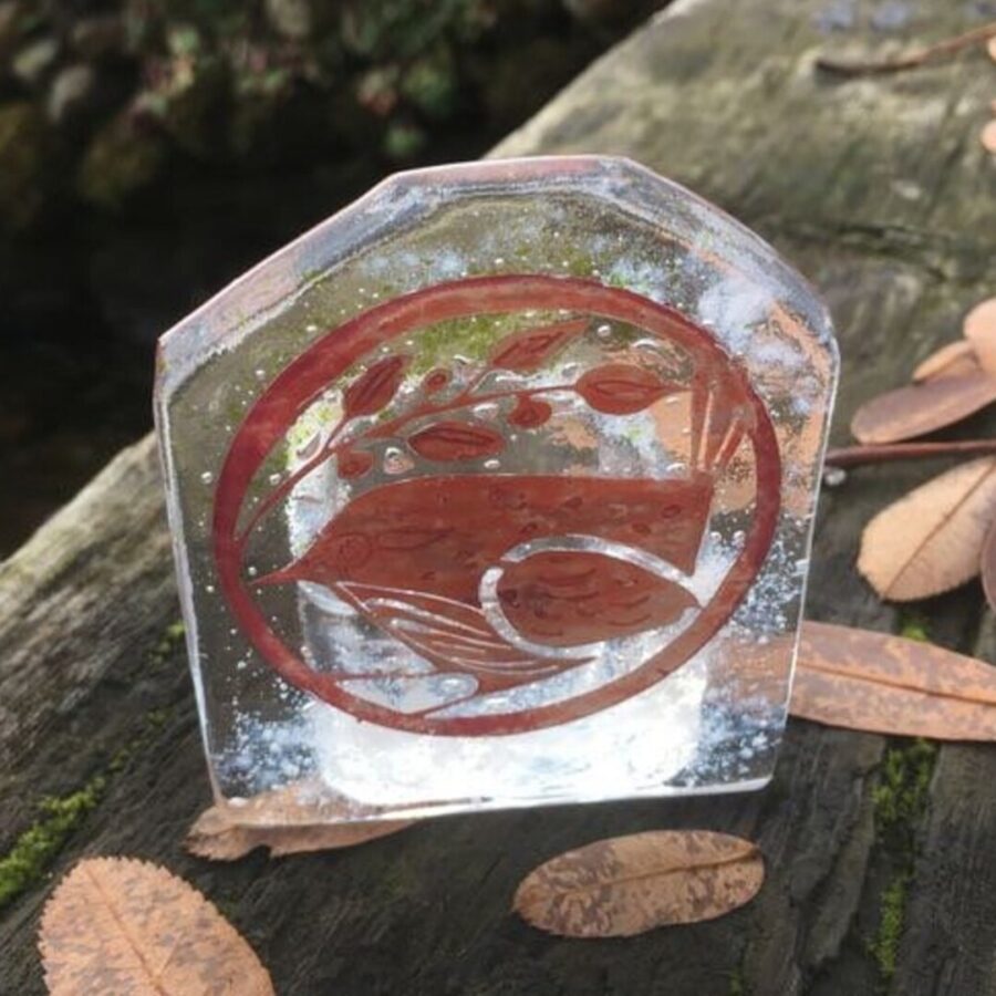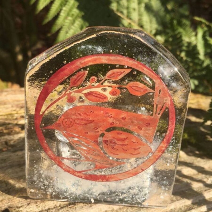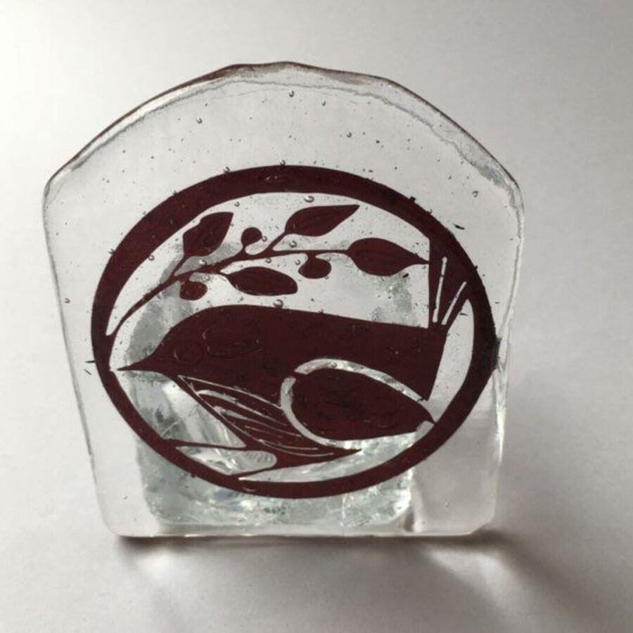 A beautiful piece made from individually decorated pieces of glass and a little copper wren encased in glass. Kiln fired and assembled into a glass tea light holder. It looks beautiful lit and equally sweet not.
