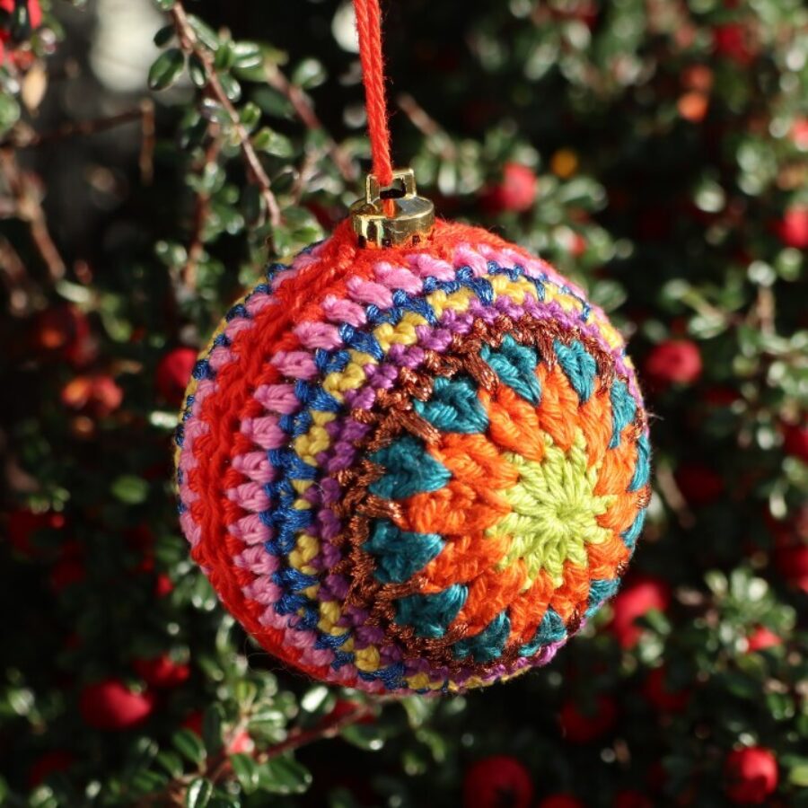 Add a splash of colour to your Christmas tree or window decoration with this crochet Christmas bauble. The bauble is lightweight shatterproof plastic and decorated with cotton thread in various colours. A glittery thread is also used to give the bauble an extra sparkle. The baubles measure approx. 6cm in diameter. This colourful ornament is perfect for a gift, something handmade and special for any Christmas décor.