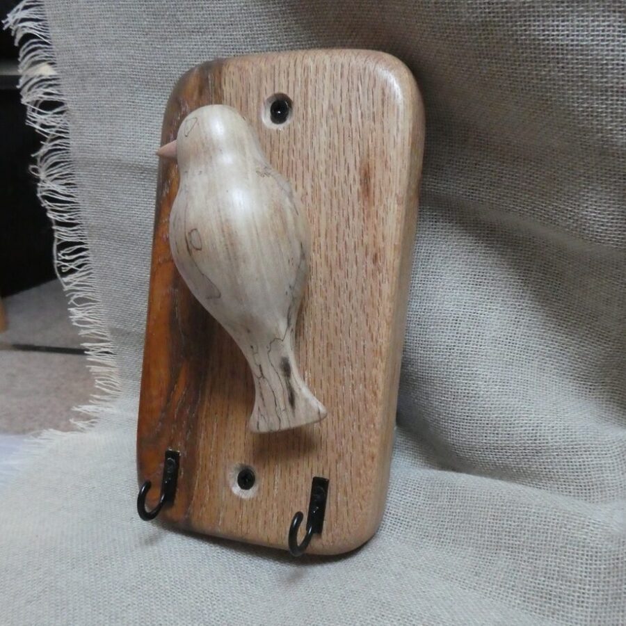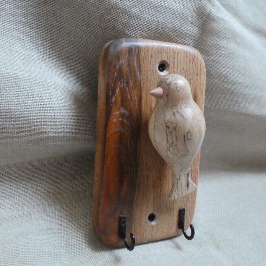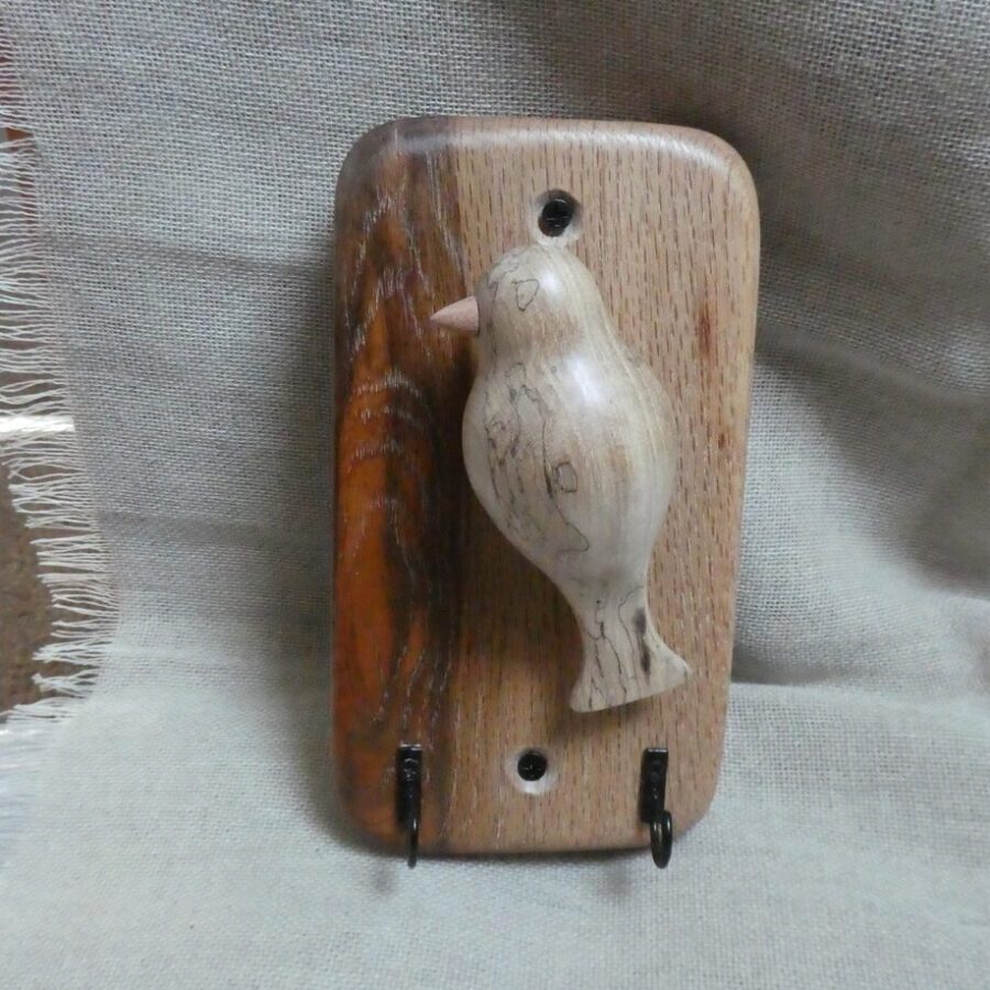 A beautiful and unique oak wood key hanger with 2 hooks and a spalted beech wood bird. The bird is handcrafted, finished with toy-safe wax and mounted on a multi-coloured oak wood plaque. This key hanger comes with 2 screws for wall mounting and is intended for hanging indoors.