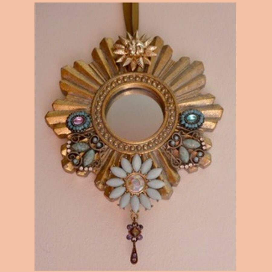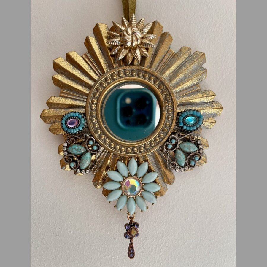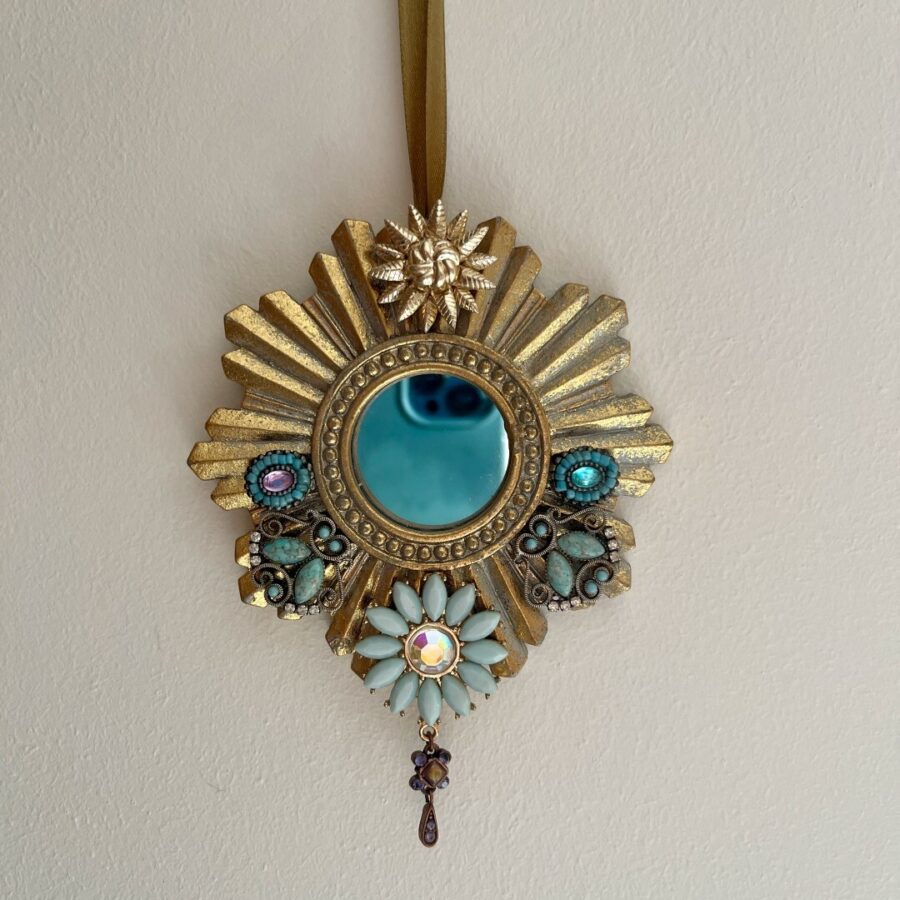 A pale blue jewelled mirror hanging ornament made from upcycled jewels. It weighs 100g so a bit too heavy to be a tree decoration, rather to be hung or displayed on the wall.