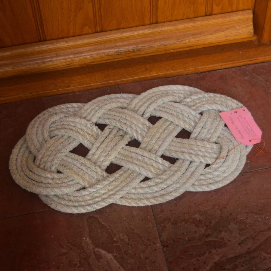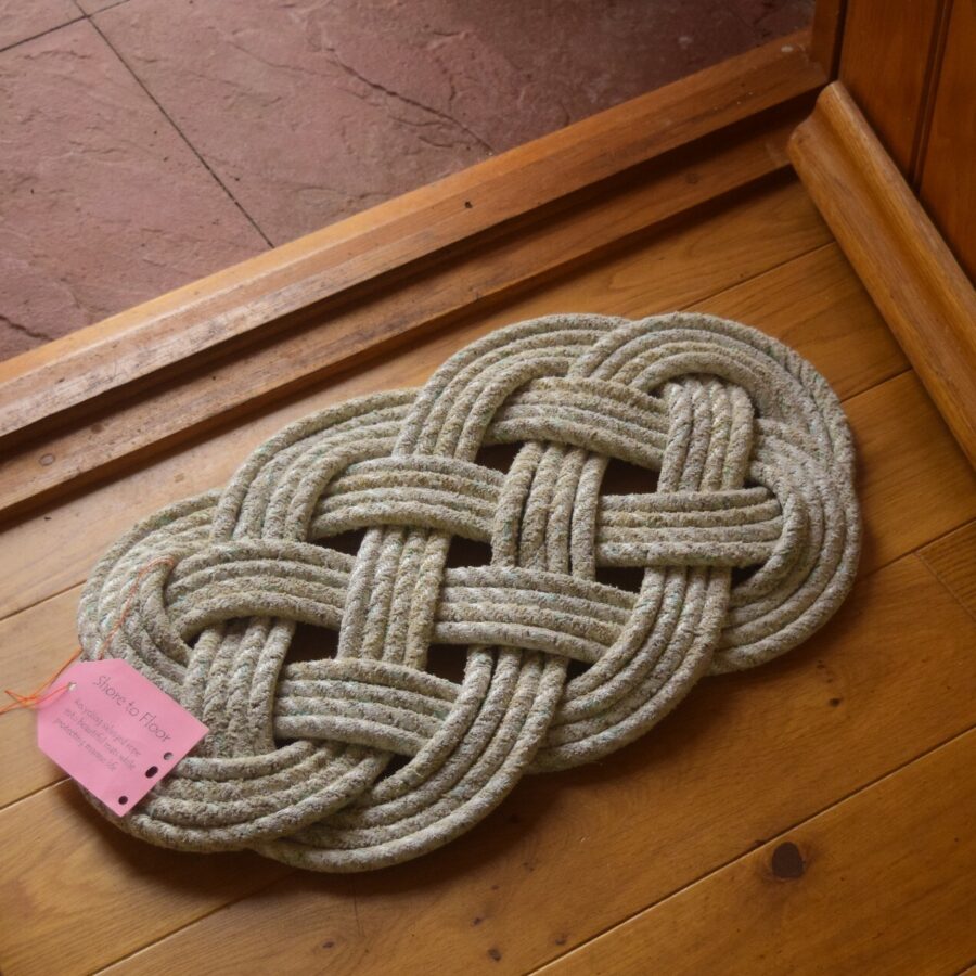 An Ocean floor mat hand-made from reclaimed rope salvaged from Eynort, Isle of Skye. Pale turquoise with turquoise fleck.