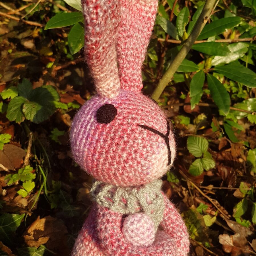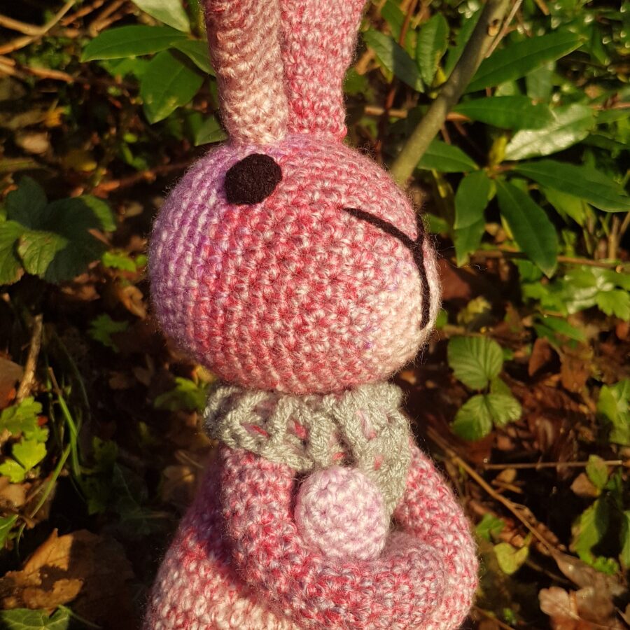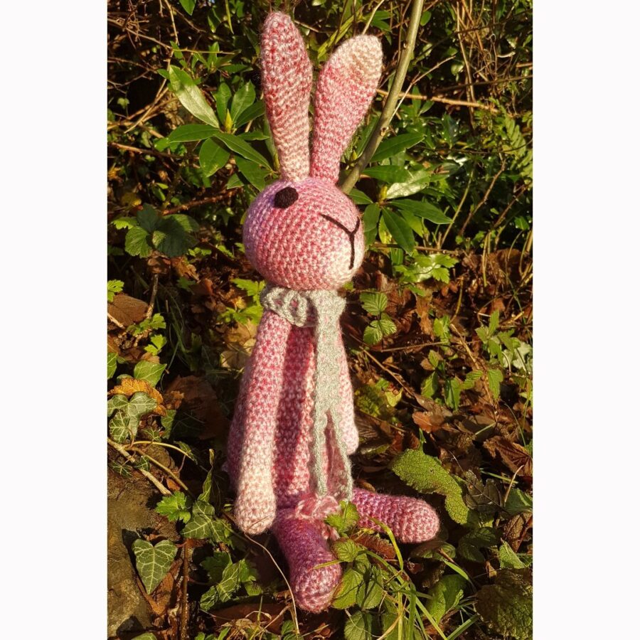 Phoebe is crochet in a lovely variegated pink/purple acrylic yarn and has crochet black eyes. She also wears a long grey scarf. Each bunny is unique in name as well as colours. Phoebe is 48cm tall and can sit upright by herself.This would be a lovely gift for anyone between 0-100. However, please note that Phoebe isn't CE marked and therefore is not a toy, rather a keepsake or it can be used as decoration. All this sellers items are made in a smoke free and pet free environment.