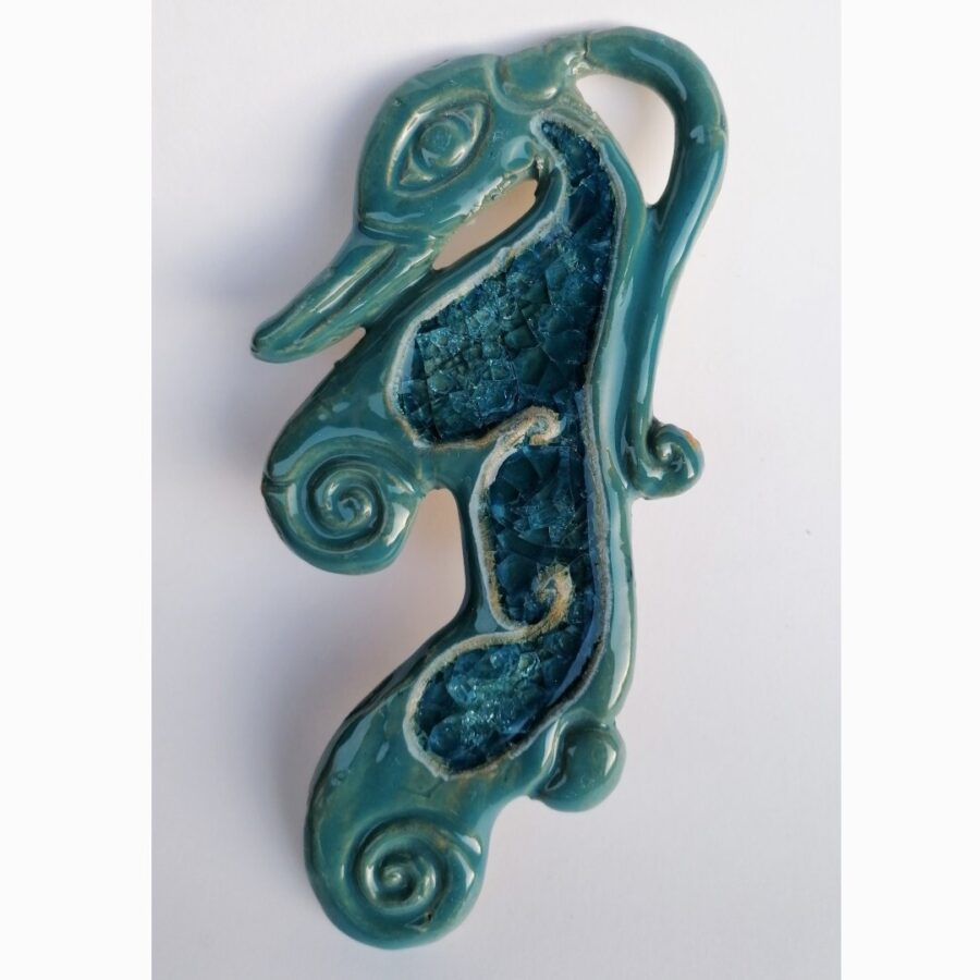 A wall hanging based on Pictish stone carvings with twin beasties. This one is in marbled blue. It's hand moulded and finished. It hangs by a pin or wall hook.