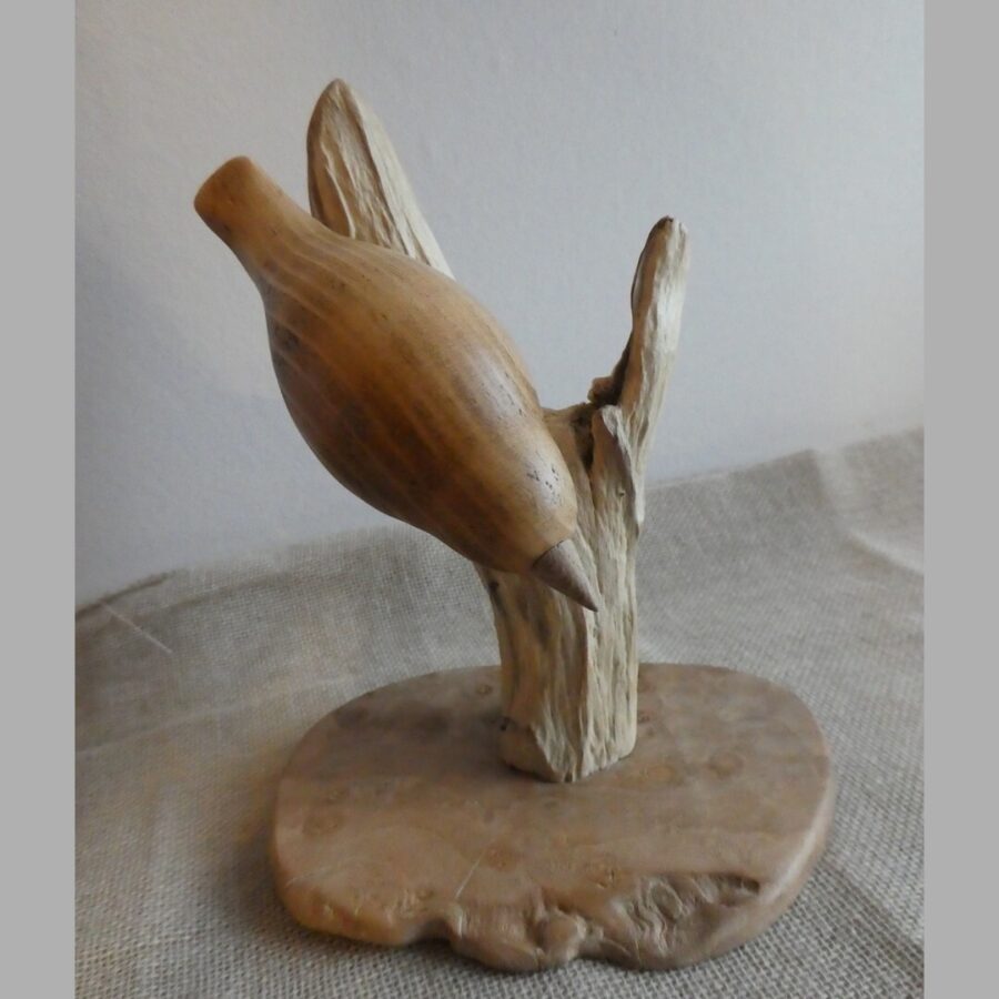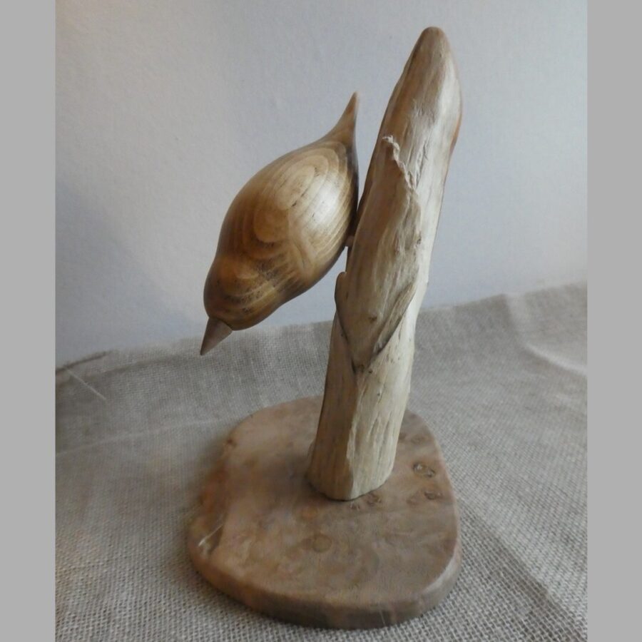 A beautiful unique hand crafted wooden nuthatch style bird. The bird is made from pine wood, mounted on a piece of driftwood and wooden base