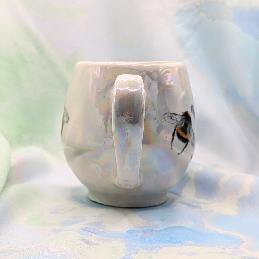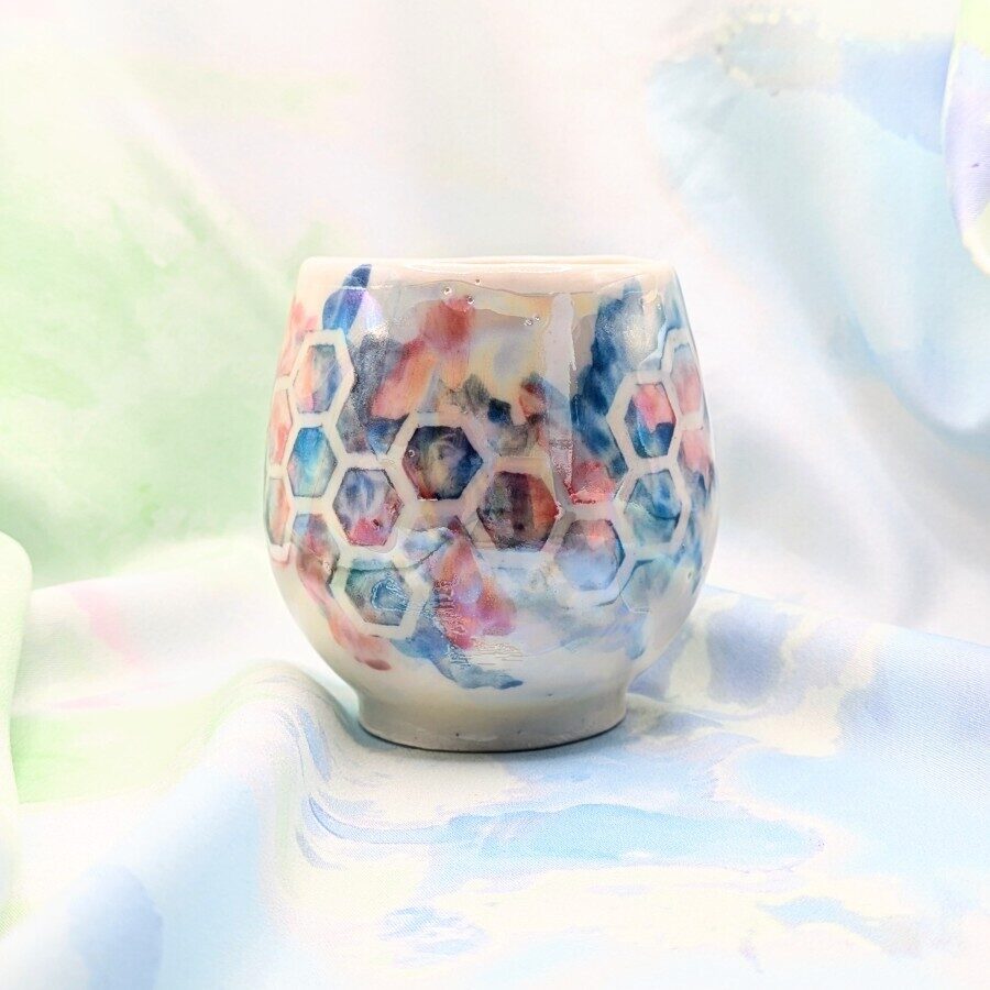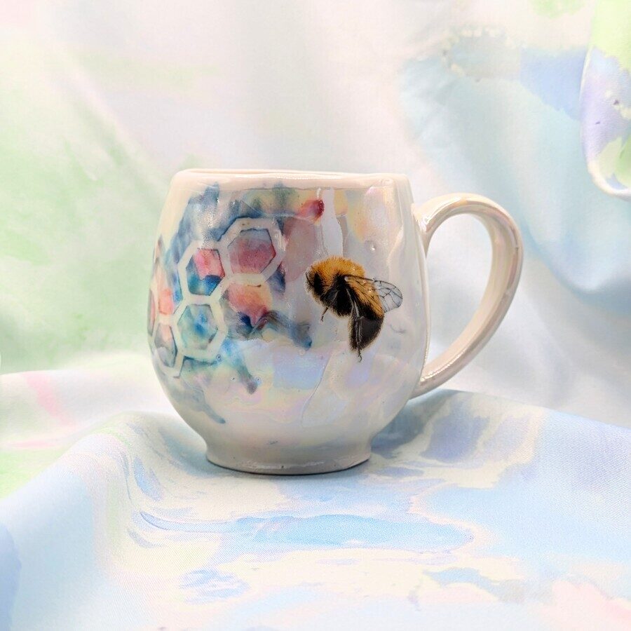 A porcelain mug with pink and blue honeycomb, bees and an iridescent sheen.