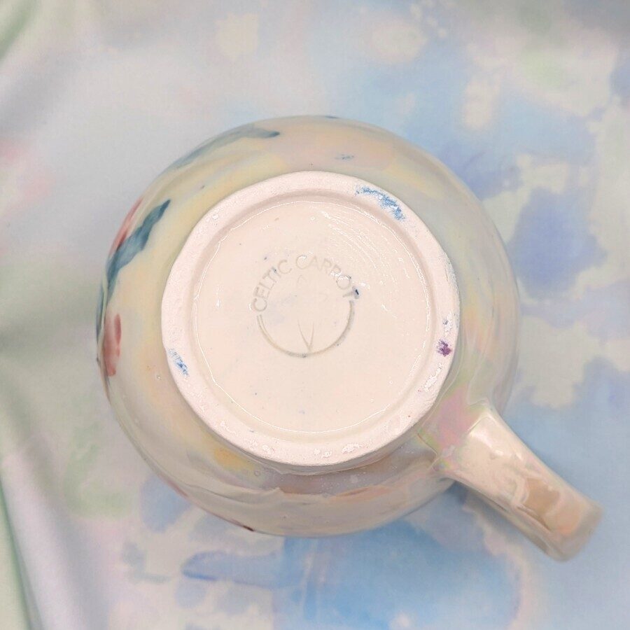 Each mug is handmade by Sarah, and decorated with underglaze watercolours. The honeycomb is carved into the mug, a technique called 'scraffito'! The mug is put through three firings, to a maximum of 1260 degrees celcius: the first firing turns the clay into ceramic and is then followed with a glaze firing. The last two firings are to add lustre - one for the bees and another for the mother of pearl which gives the iridescent finish. The whole process from start to finish takes about a week and is a true labour of love. Sarah is always excited to open the kiln and see the finished product!