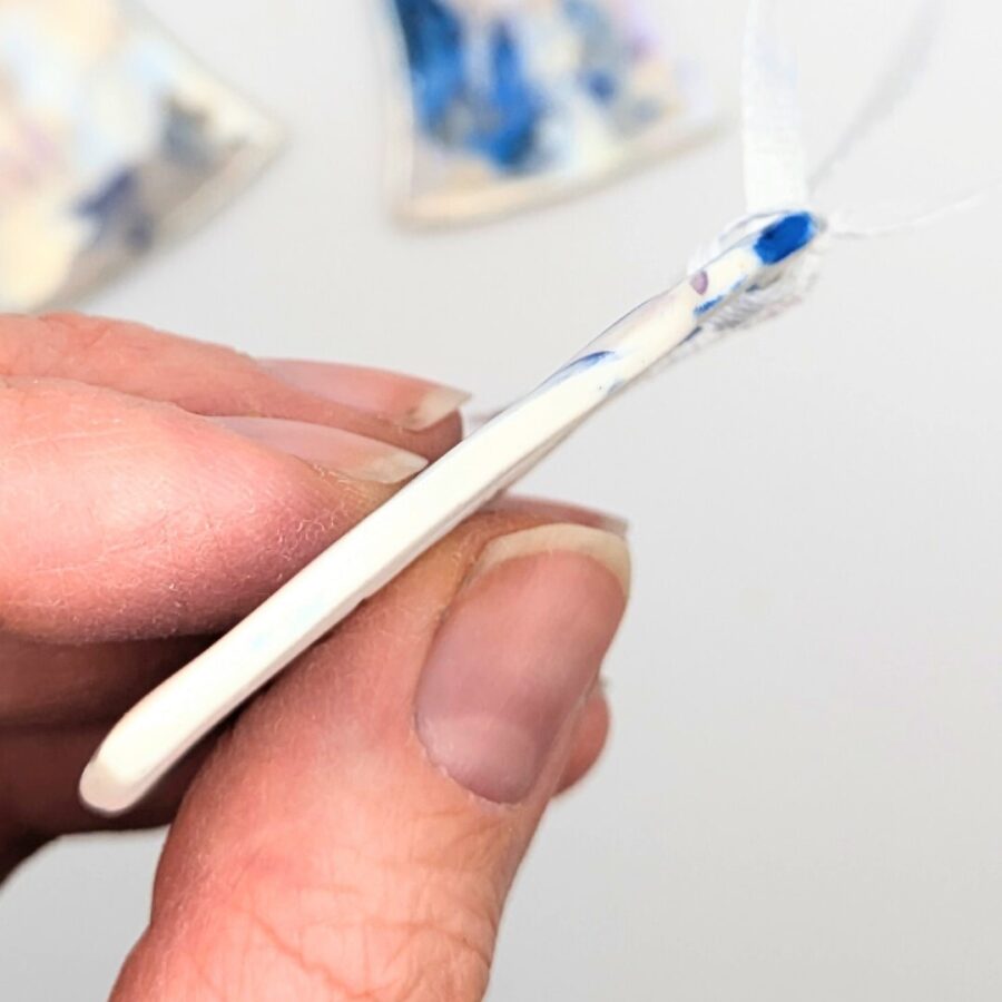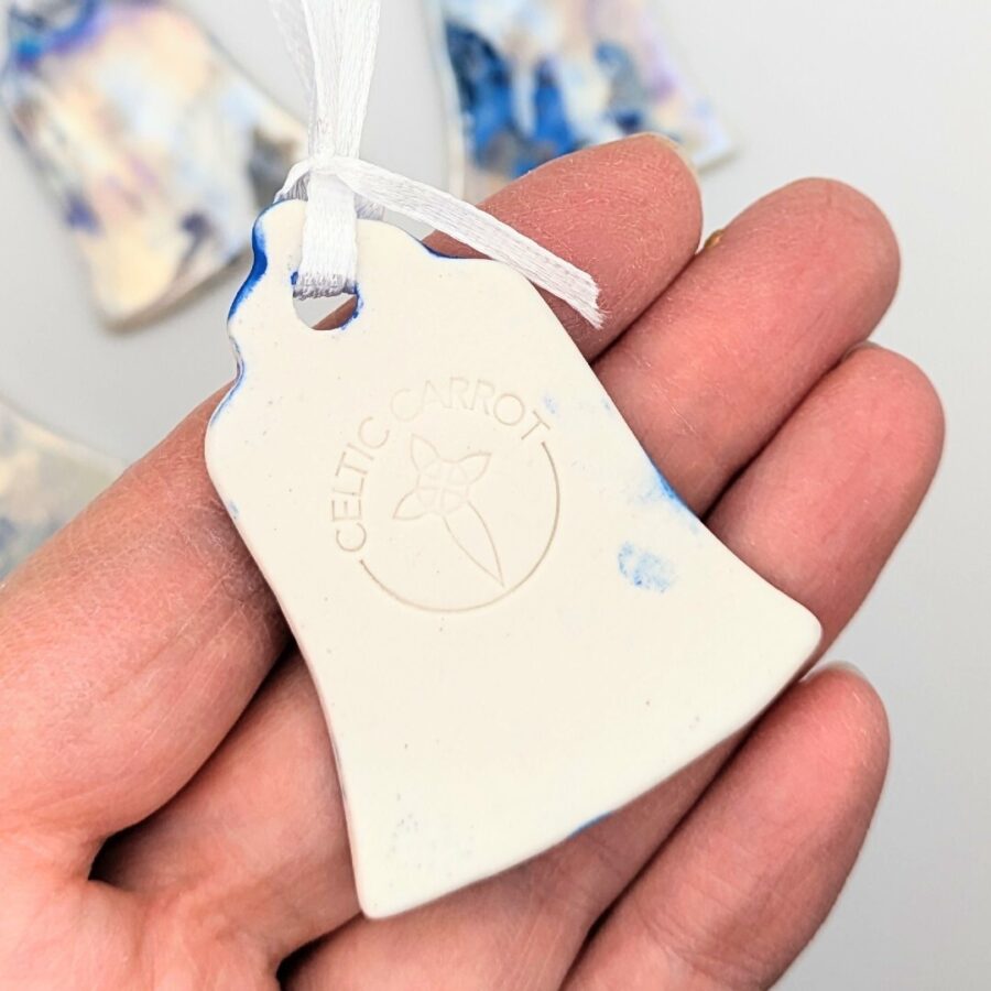 A ceramic Christmas tree decoration with blue and purple underglaze decoration and some stars carved into the clay. Finished with a mother of pearl iridescent sheen and a ribbon, all ready for your tree!
