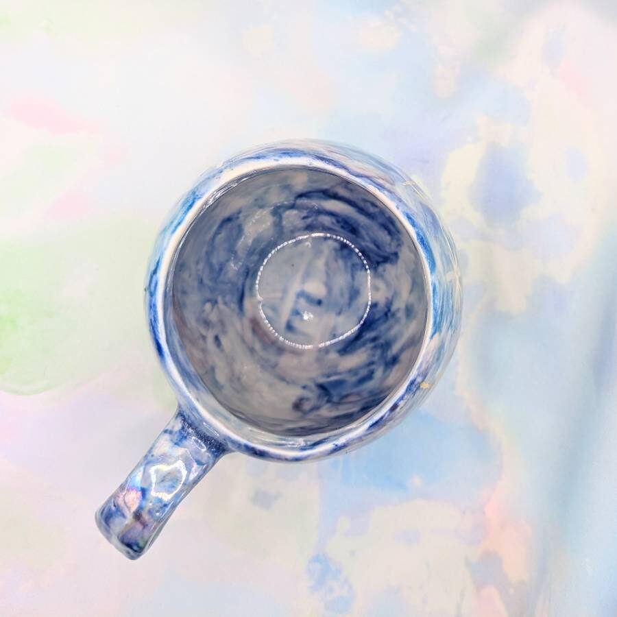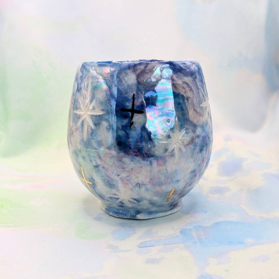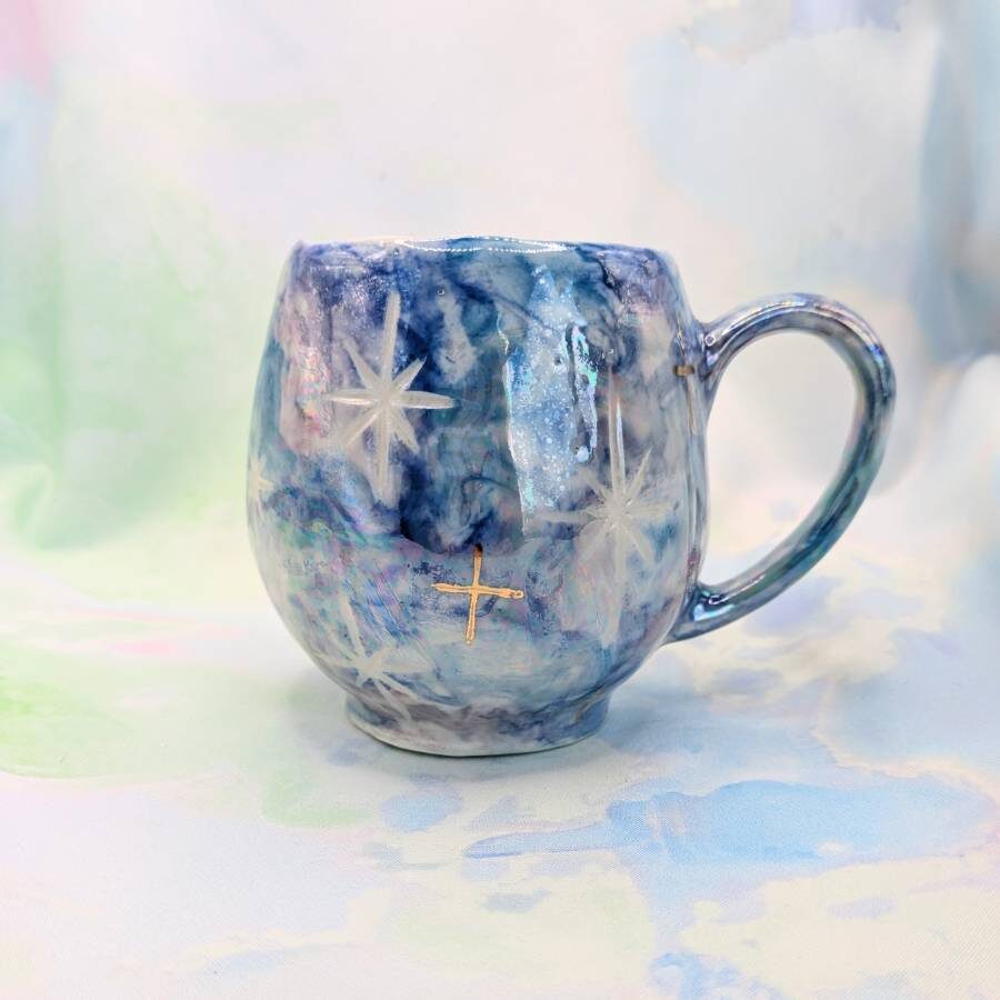 A beautiful porcelain moon and stars mug with gold stars and an iridescent sheen.