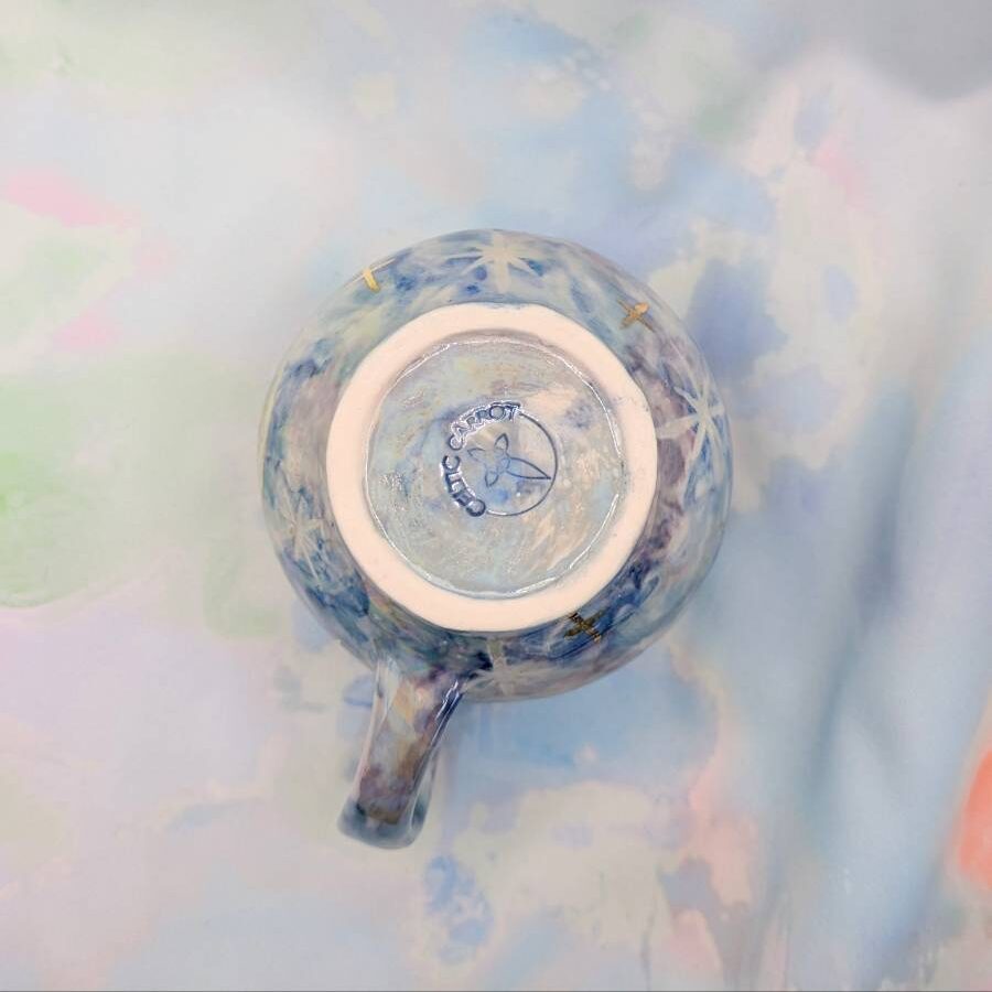 Each mug is handmade by Sarah, and decorated with underglaze watercolour detail. The moon and stars are then carved into the mug, a technique called 'scraffito'! Then the mug is put through four firings, to a maximum of 1260 degrees celsius: the first firing turns the clay into ceramic and is then followed with a glaze firing. The last two firings one for the gold lustre stars and another for the mother of pearl which gives the iridescent finish. This firing is done outside because of any fumes released from the lustre. The whole process from start to finish takes about a week and is a true labour of love.