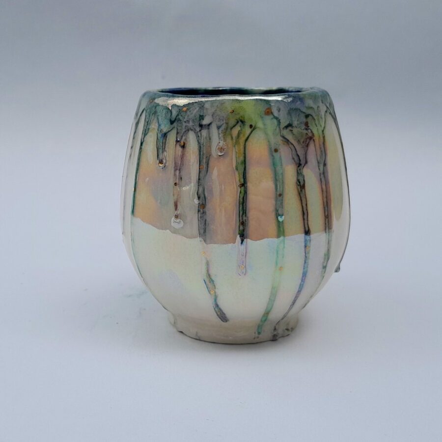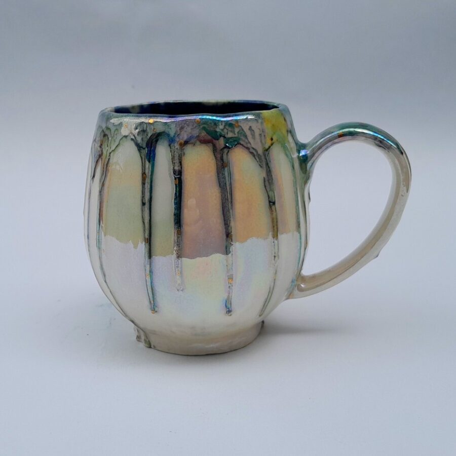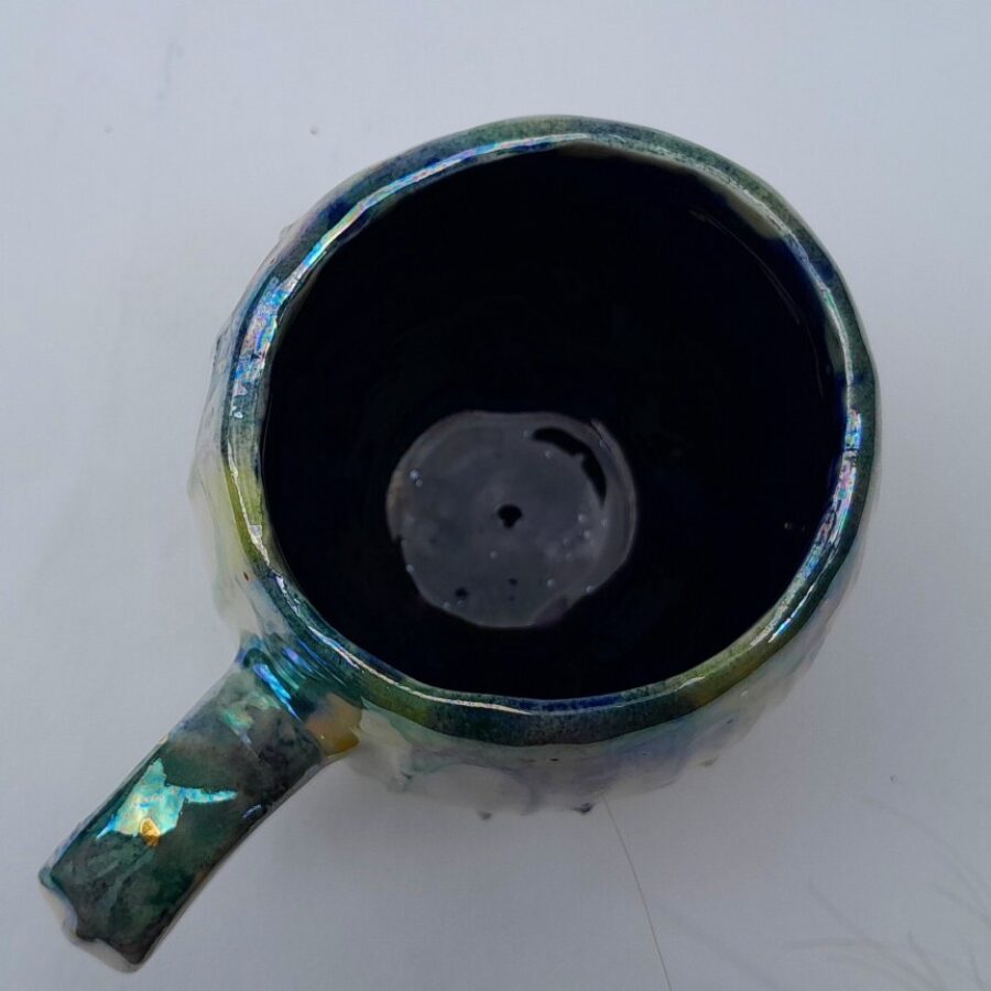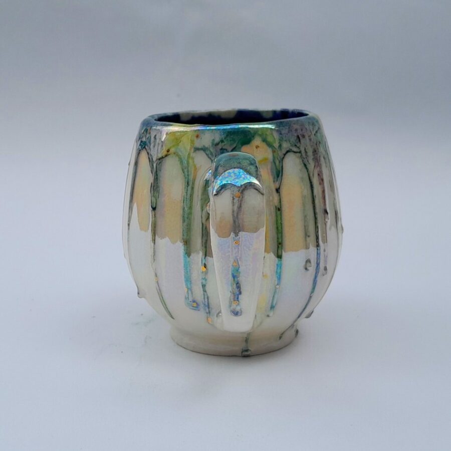Slip cast in porcelain then the maker dribbles liquid porcelain around the rim and decorates it with a variety of underglazes. It is then fired four times and finished off with mother of pearl lustre to which gives it an iridescent finish. This mug holds 250ml. Not suitable for dishwasher or microwave due to the lustres.