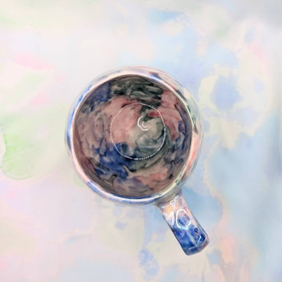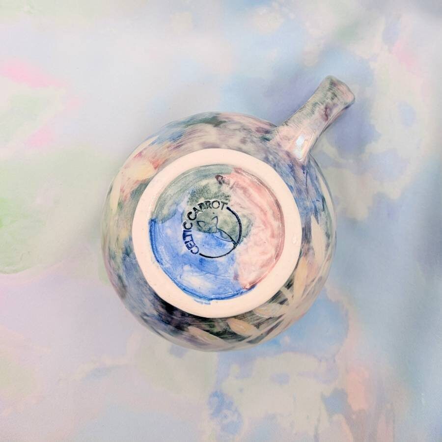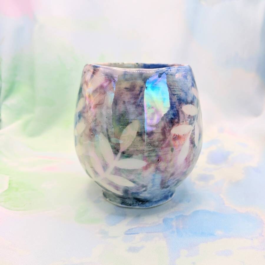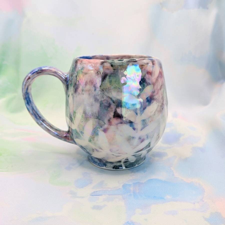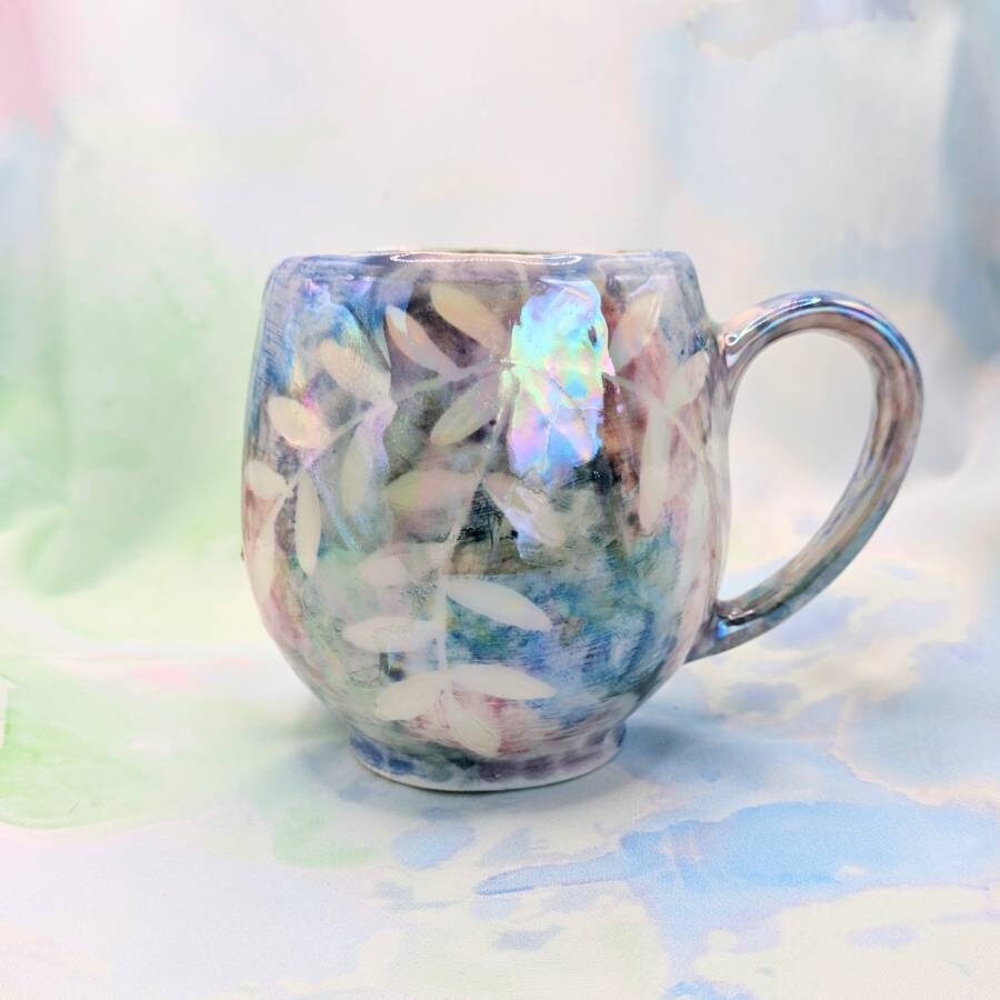 A porcelain mug with watercolour underglaze, white vines and an iridescent sheen.
