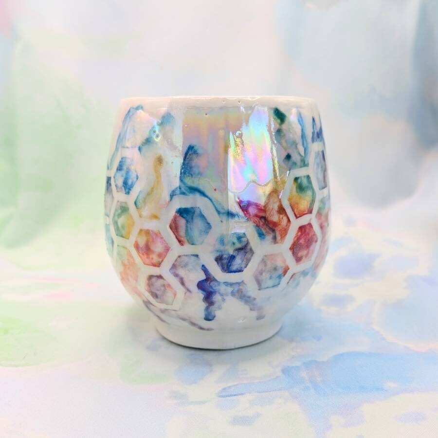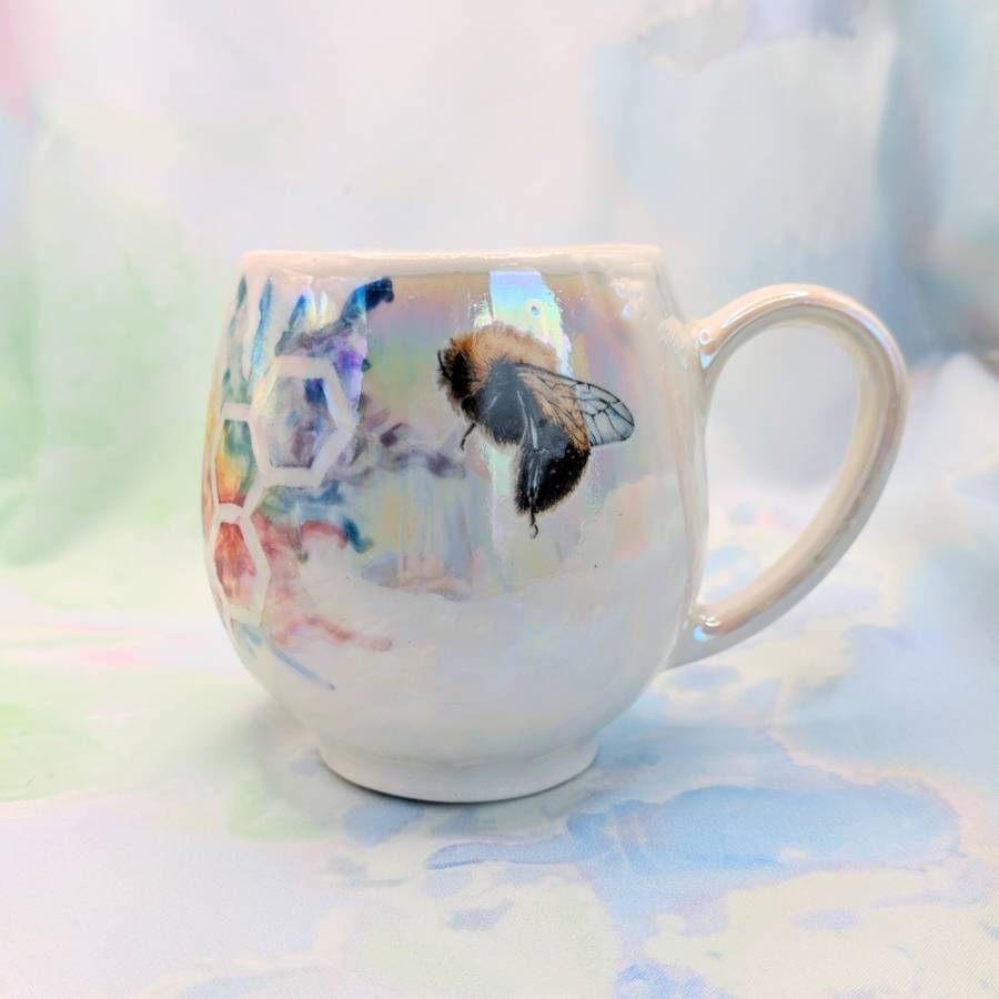 A bee-autiful addition to your kitchen cupboards! A porcelain mug with underglaze rainbow honeycomb decoration, bee decals and finished with mother of pearl lustre.