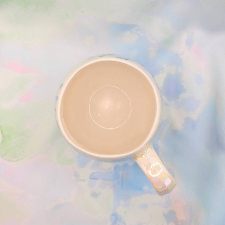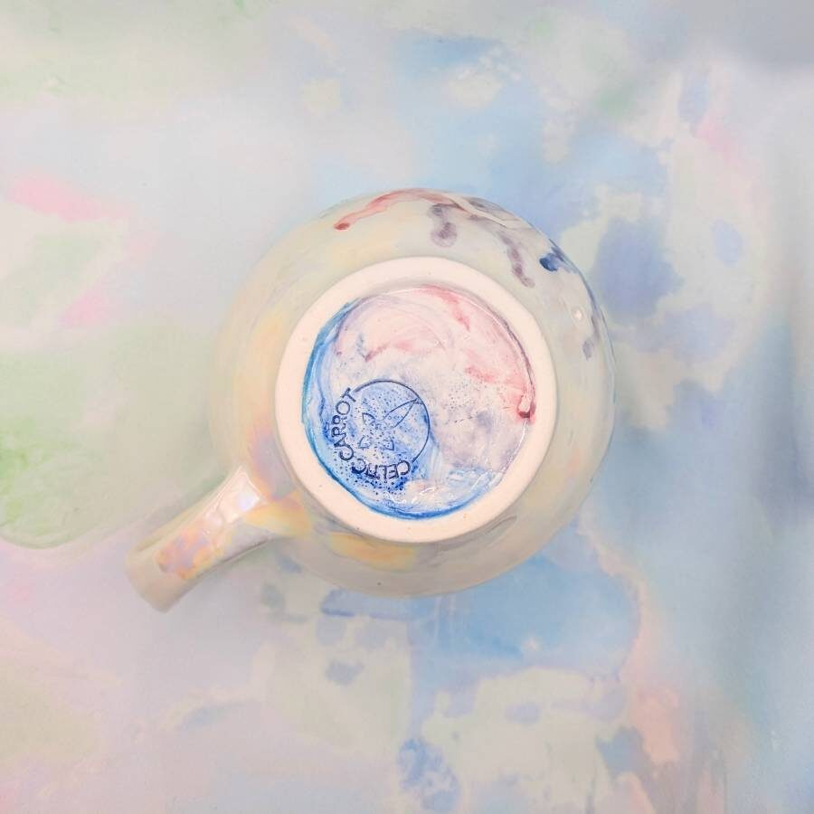 Each mug is handmade by Sarah, and decorated with underglaze watercolour detail. The honeycomb is then carved into the mug, a technique called 'scraffito'! Then the mug is put through four firings, to a maximum of 1260 degrees celsius: the first firing turns the clay into ceramic and is then followed with a glaze firing. The last two firings are to add the bees and then the mother of pearl lustre which give an iridescent finish. This firing is done outside because of any fumes released from the lustre. The whole process from start to finish takes about a week and is a true labour of love.