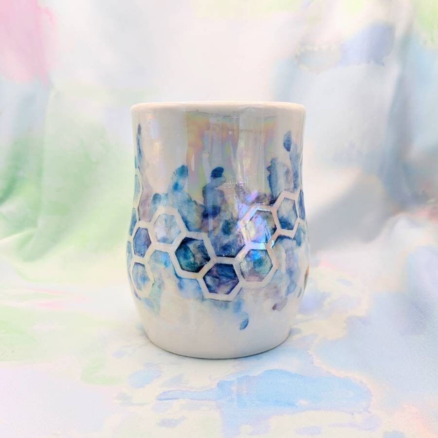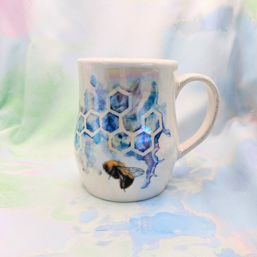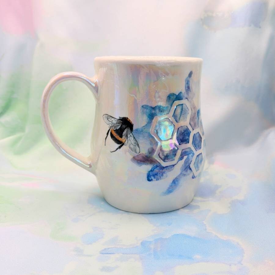 A bee-autiful addition to your kitchen cupboards! A porcelain mug with underglaze honeycomb decoration, bee decals and finished with mother of pearl lustre.