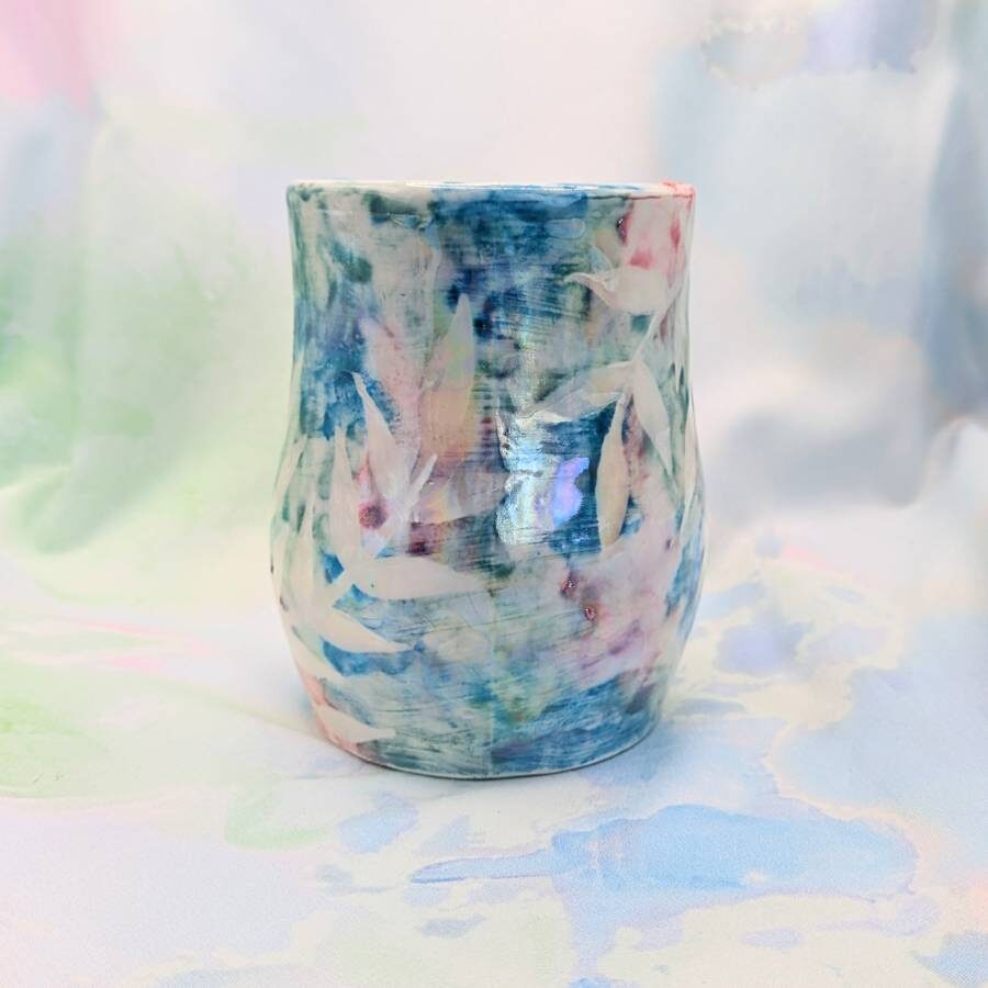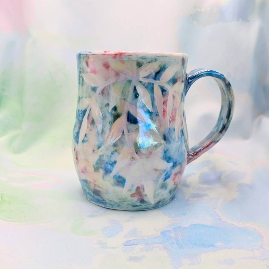 A beautiful porcelain mug with underglaze decoration, white leaf design and finished with mother of pearl lustre.