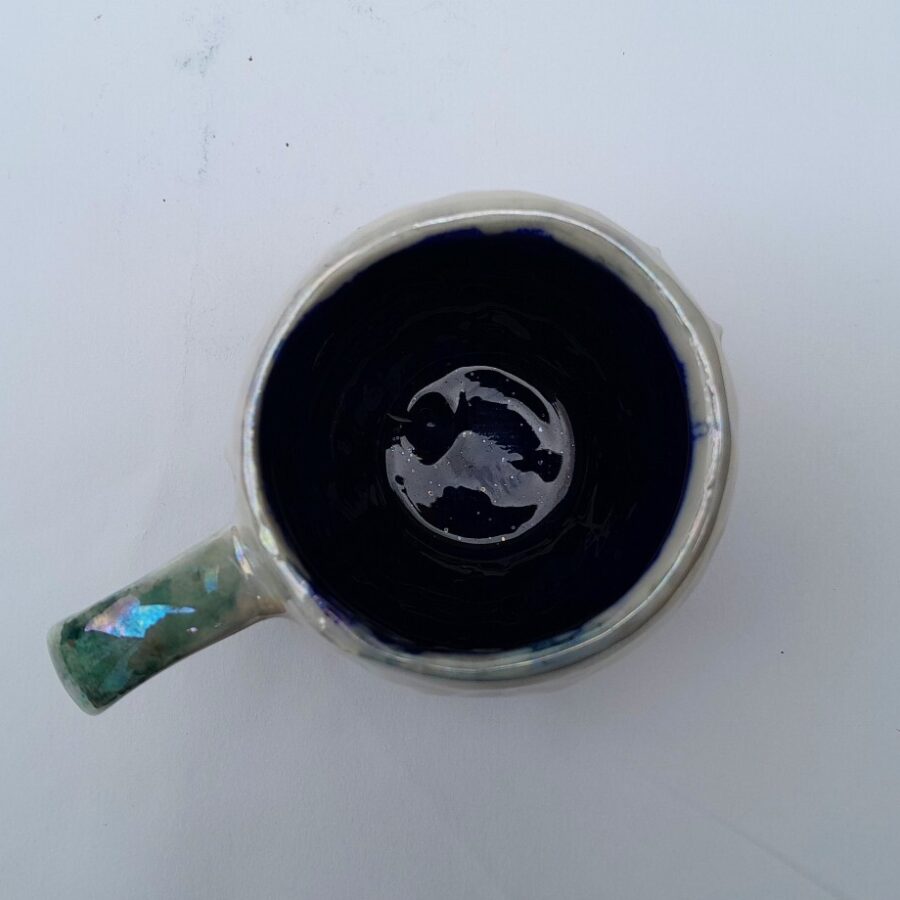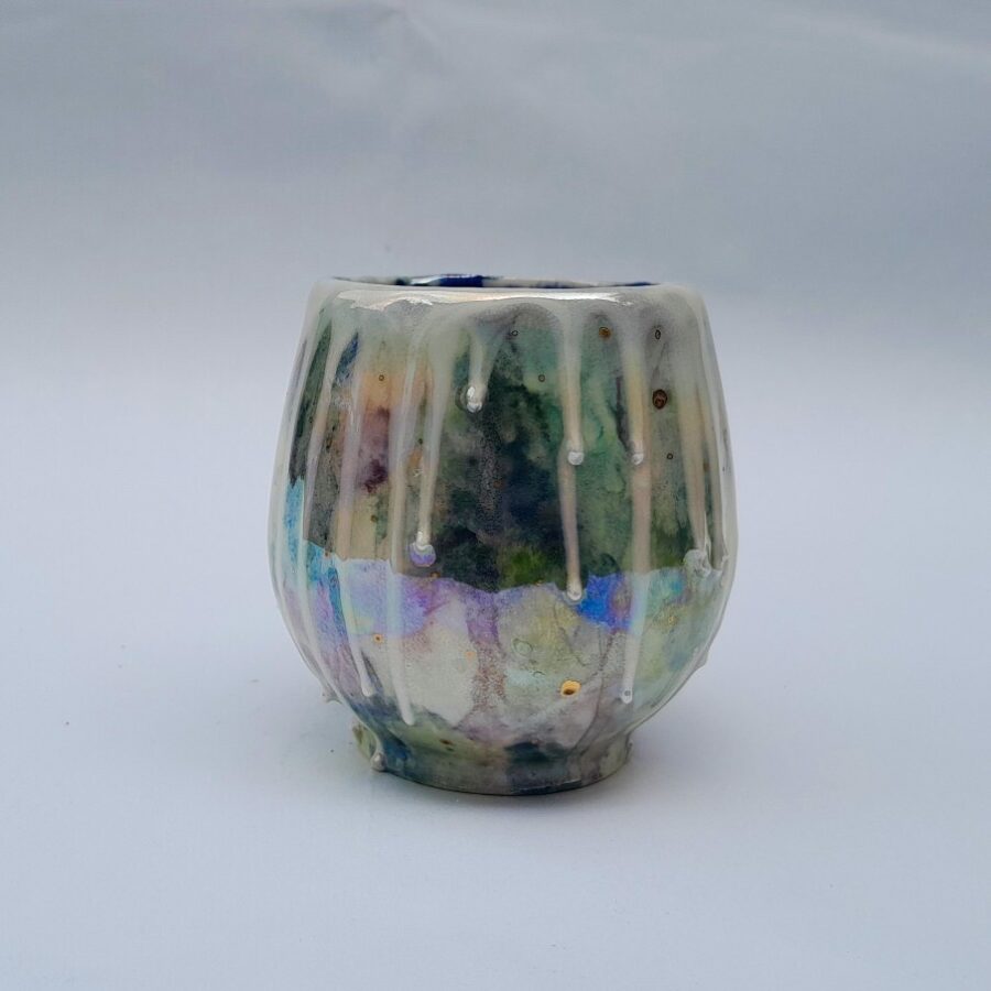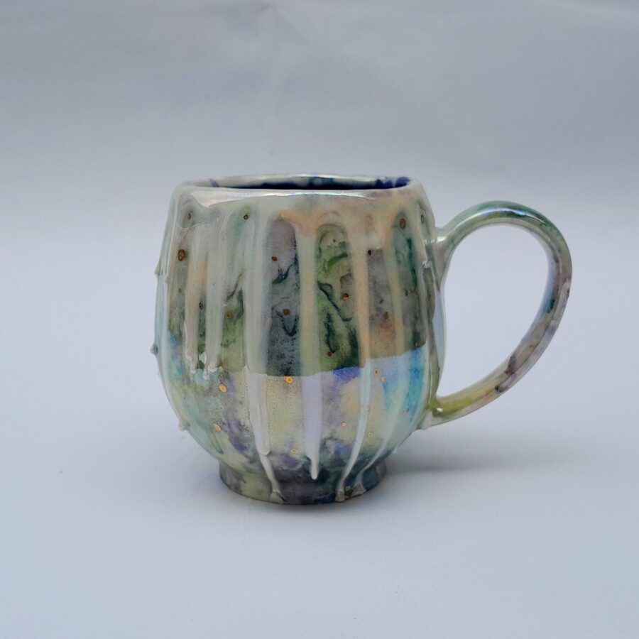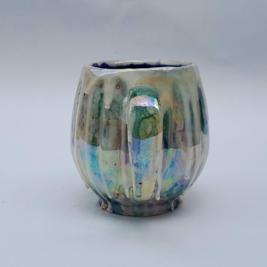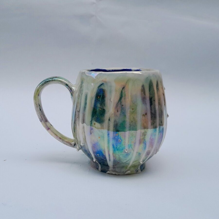 Slip cast in porcelain then decorated by hand using a variety of beautiful underglazes. Sarah then dribbles liquid porcelain around the rim to complete the drippy look. Each mug is then fired four times and finished with mother of pearl lustre which really brings out the colours. This mug holds 250ml. Not suitable for dishwasher or microwave due to the lustres.