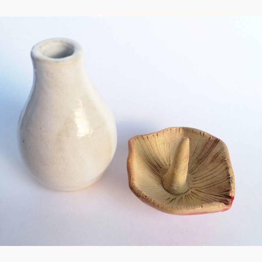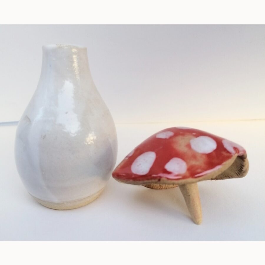 A pottery toadstool vase with separate lid, perfect for storing fairy potions in, hand thrown built and painted. Food safe. Dishwasher and microwave safe.
