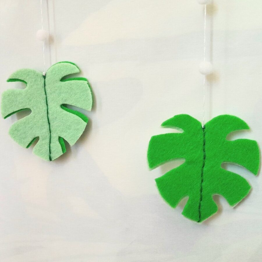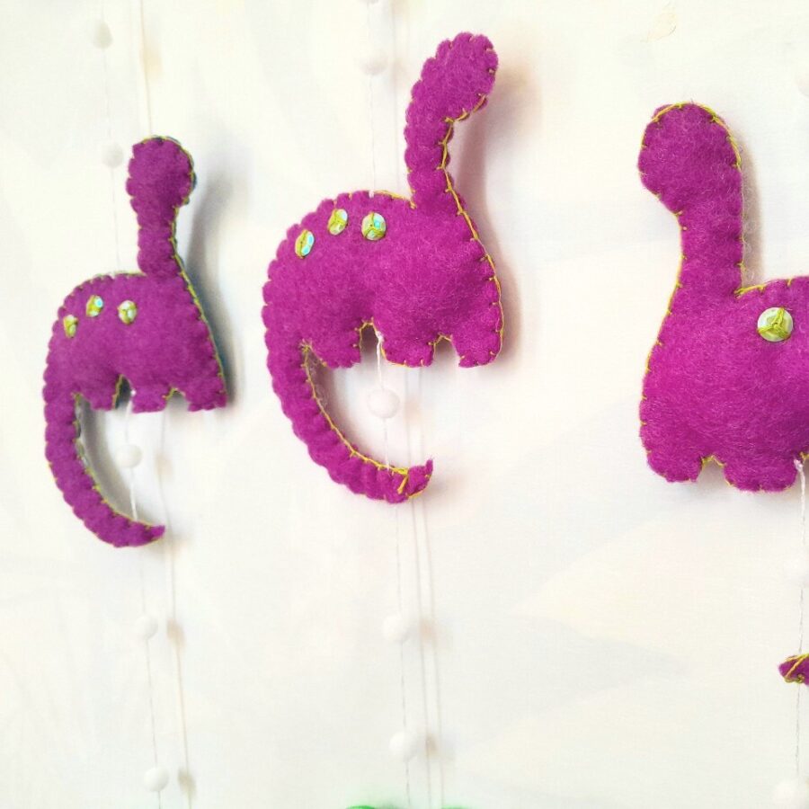 A purple felt diplodocus decoration which has been handmade by Sarah with white clouds and two tone monstera leaves. Finished with sequins and mini pom poms. Fun to look at but not a toy, so keep out of the reach of children.