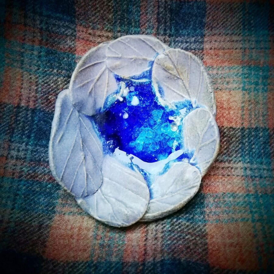A small purple and blue dish with leafy border. Hand thrown sculpted. Not Food safe.