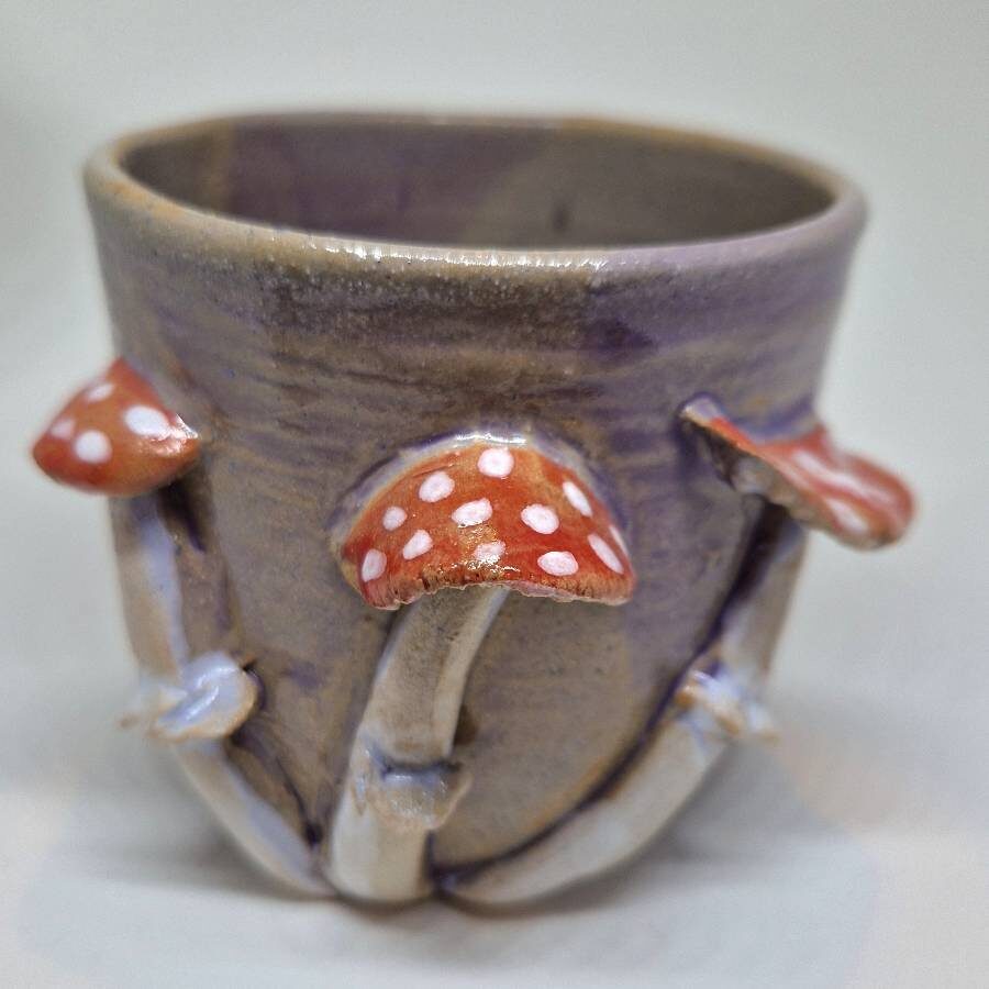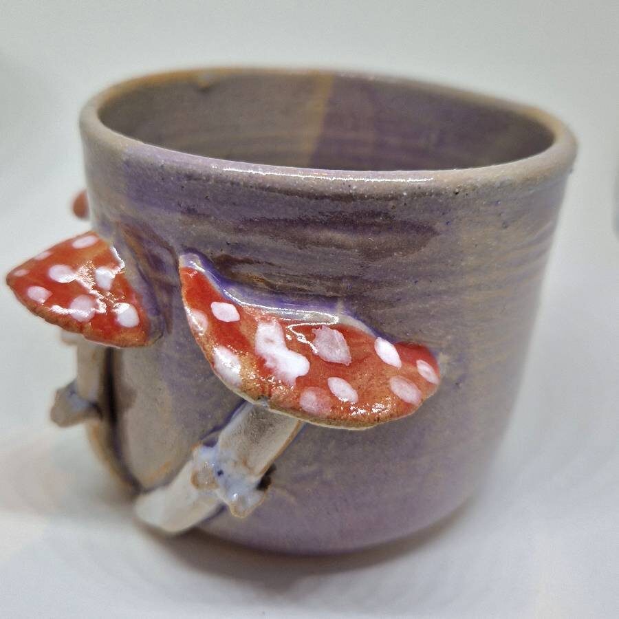A purple pot with hand sculpted and glazed toadstools on it. Hand thrown & sculpted. Food safe.
