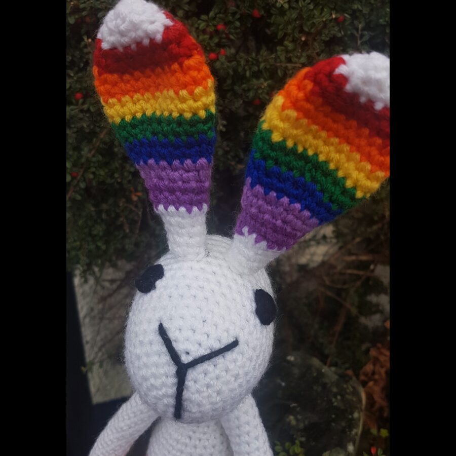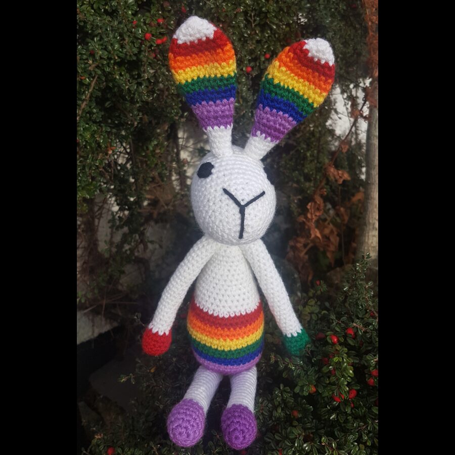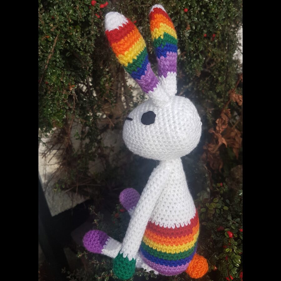 This gorgeous rainbow bunny is crochet in a lovely variegated coloured acrylic yarn. He has crochet black eyes, is 42 cm tall, and can sit upright by himself. This would be a lovely gift for anyone between 0-100.