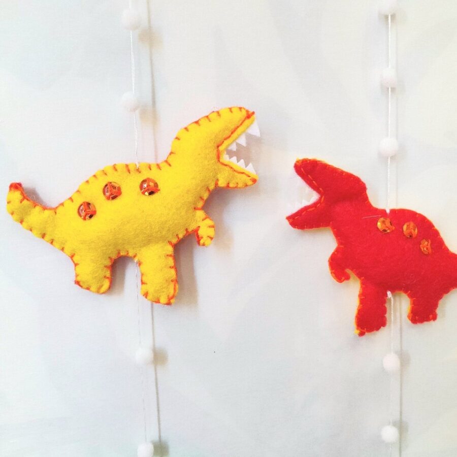 A red and yellow chompy T-Rex decoration, complete with white clouds and two tone monstera leaves. Each T-rex is individually made so slight differences may occur. Bound to brighten up any room but is not a toy so keep out of the reach of children.
