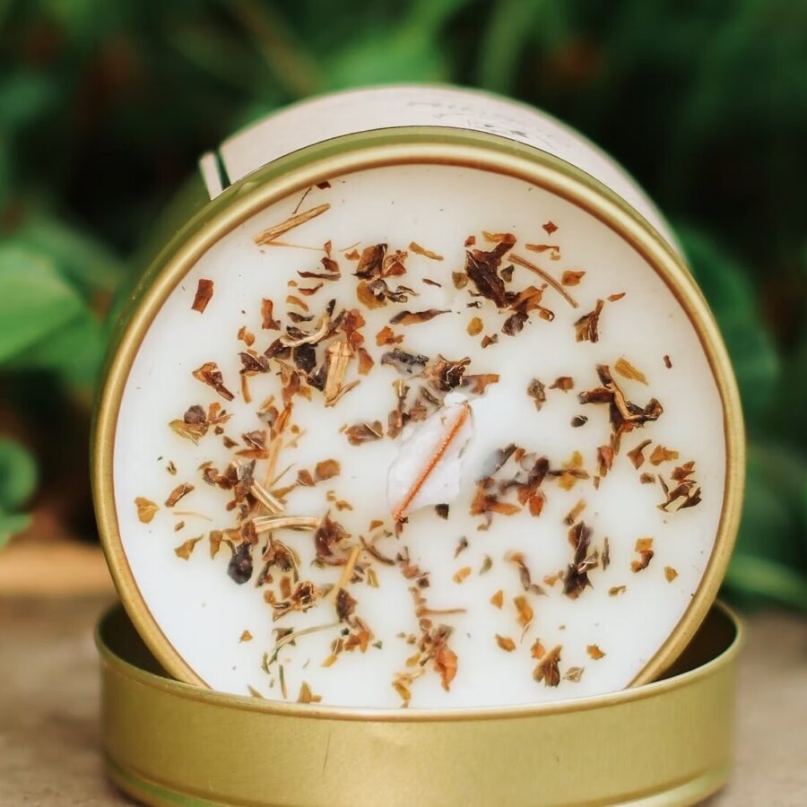 A luxurious gold 10cl tin soy wax candle in a range of local Scottish scents (select using drop down) offering a true feeling of the Scottish Highlands using natural products and materials. With a textured top of the individual scent and natural cotton wick. Many of the scents that inspire this range of candles grow freely on the makers croft e.g. gorse, heather, wild raspberry and mint. Candles are poured in small batches to ensure perfect scent distribution for a clean and even burn every time.