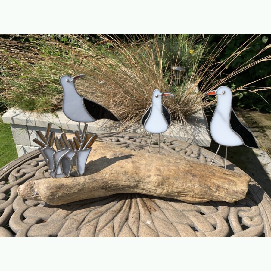Seagull group. Handmade with stained glass and finished on natural driftwood.