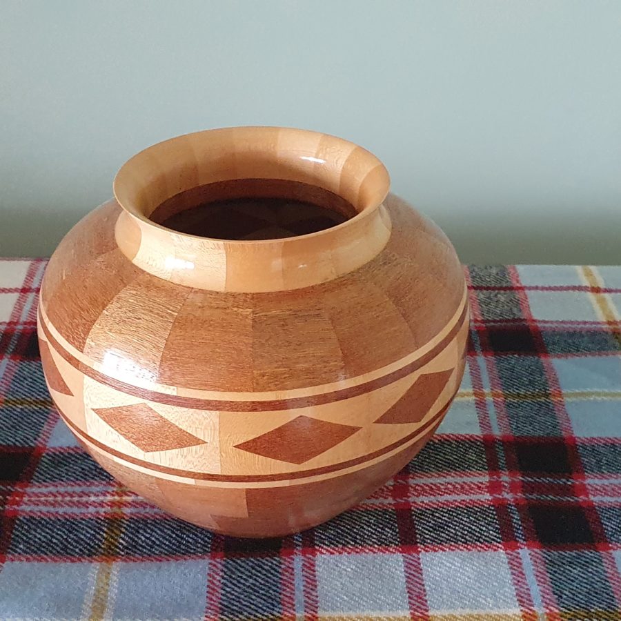 Segmented vase with diamond features in dark elm and sycamore finished in carnauba wax for a high gloss finish