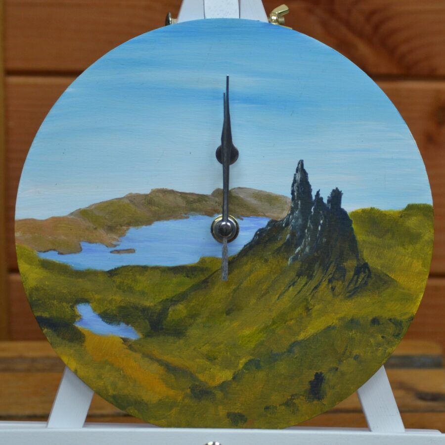 A round wall clock on 6mm birch ply painted in acrylic with a scene of Skye and a varnished clock face.