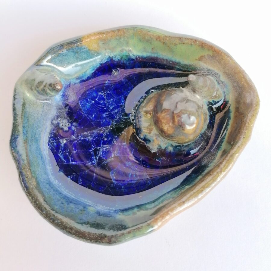 A small rockpool, pinched and sculpted then finished with blue melted glass for a sparkling seawater effect. Not food safe.