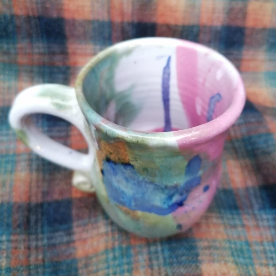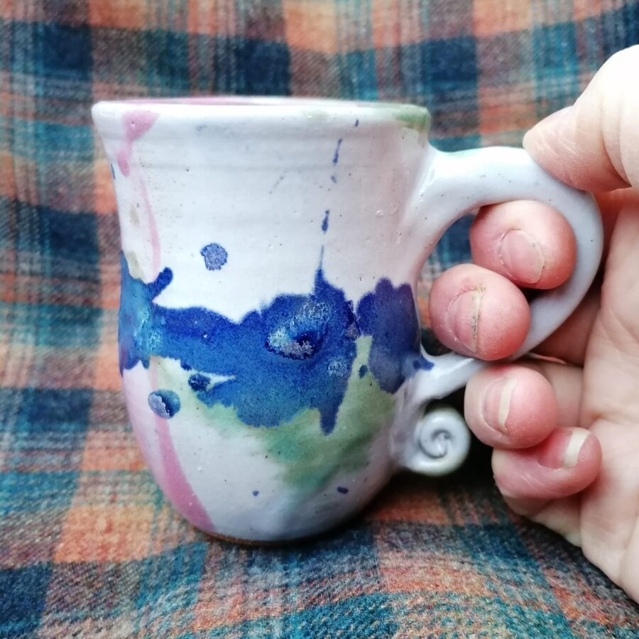 A small stoneware mug in bright colours. Hand thrown on the wheel. Food safe. Dishwasher and microwave safe.