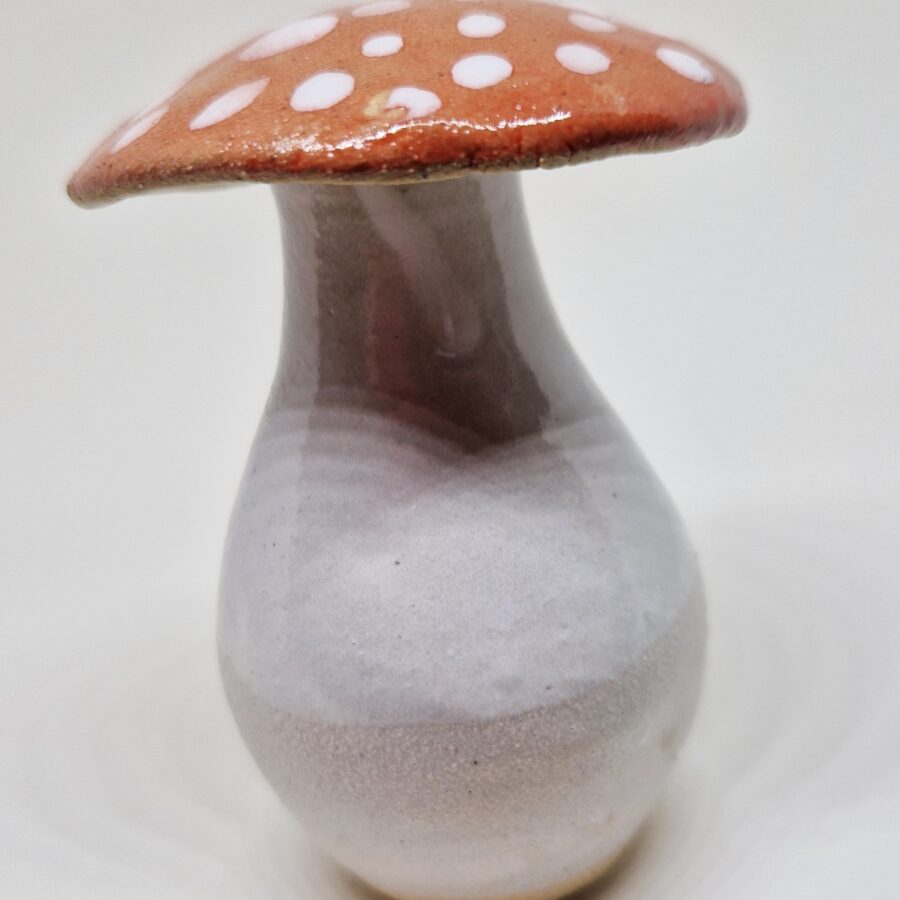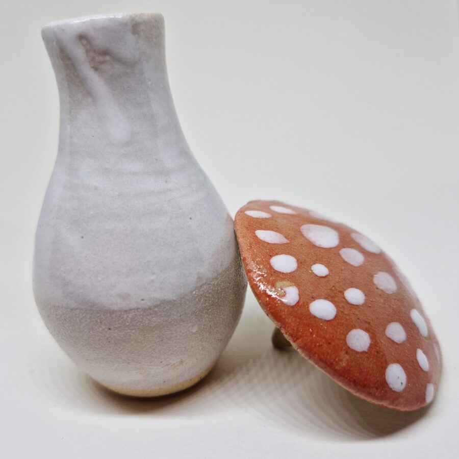 A pottery toadstool vase with separate lid, perfect for storing fairy potions in, hand thrown built and painted. Food safe. Dishwasher and microwave safe.