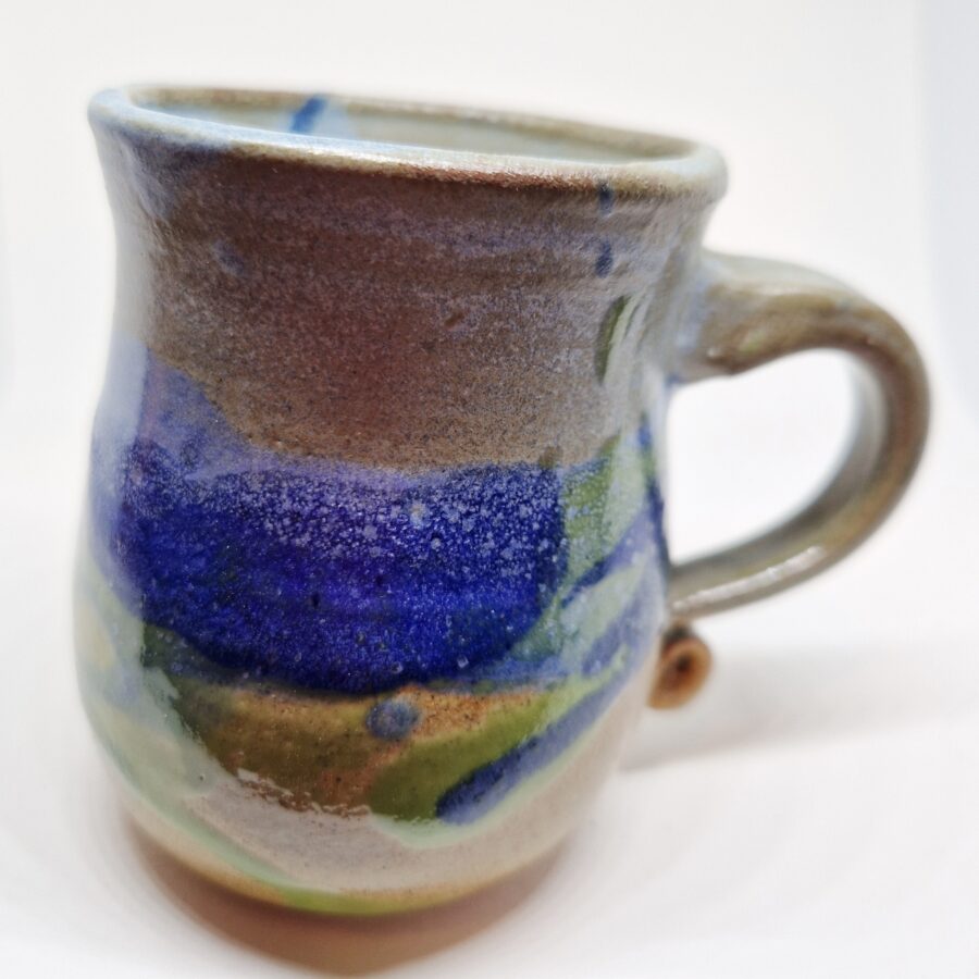 A small stoneware mug in blues, greys and green colours. Hand thrown on the wheel. Food safe. Dishwasher and microwave safe.