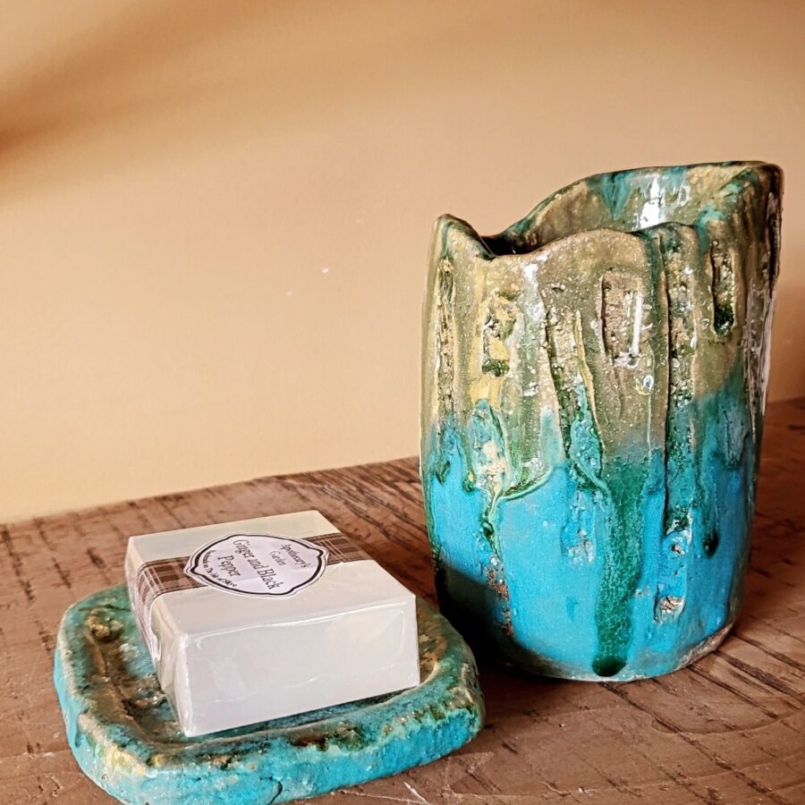 A beautiful soap dish and matching vessel hand-thrown in stone with mixed reactive glazes.