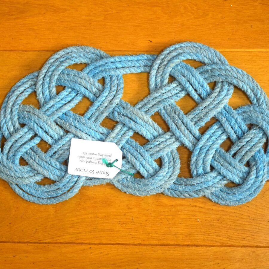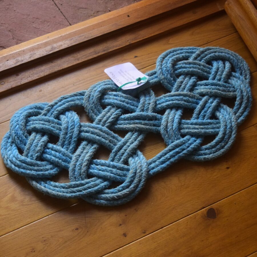A trapezoid design mat hand-made from reclaimed rope salvaged from Caroy Beach, Isle of Skye. Blue. Suitable as a small indoor floor mat.