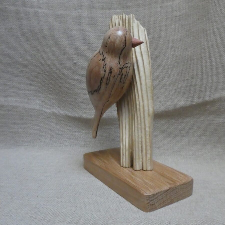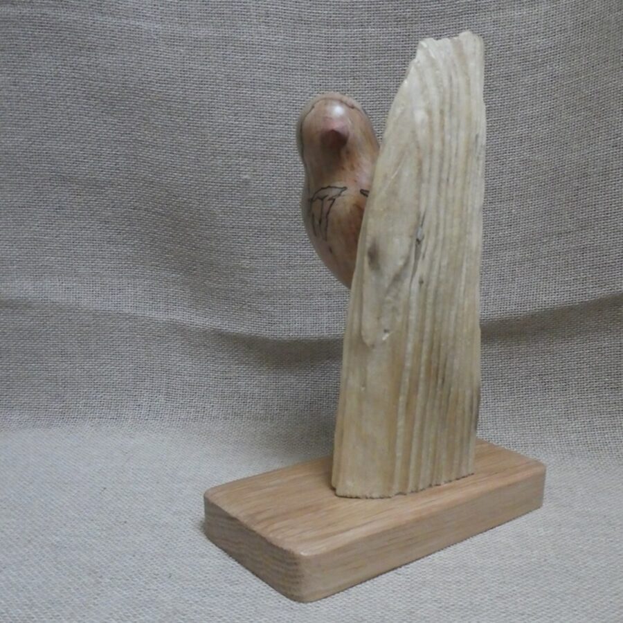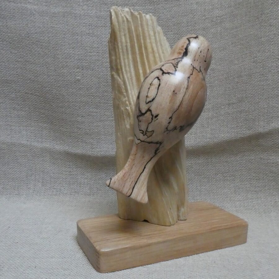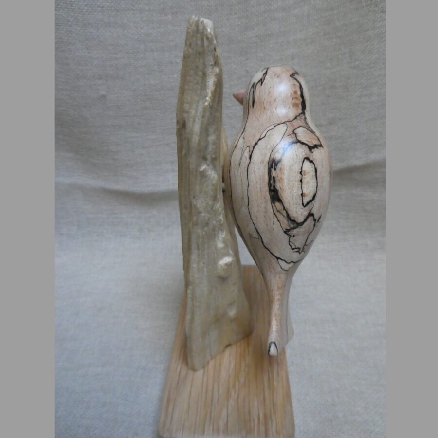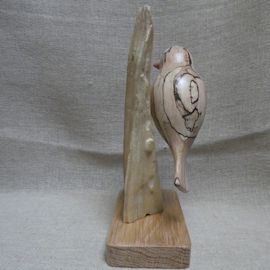 A beautiful unique hand crafted bird sculpture. The bird is made from spalted beech wood, mounted on a piece of light textured driftwood and an oak base.
