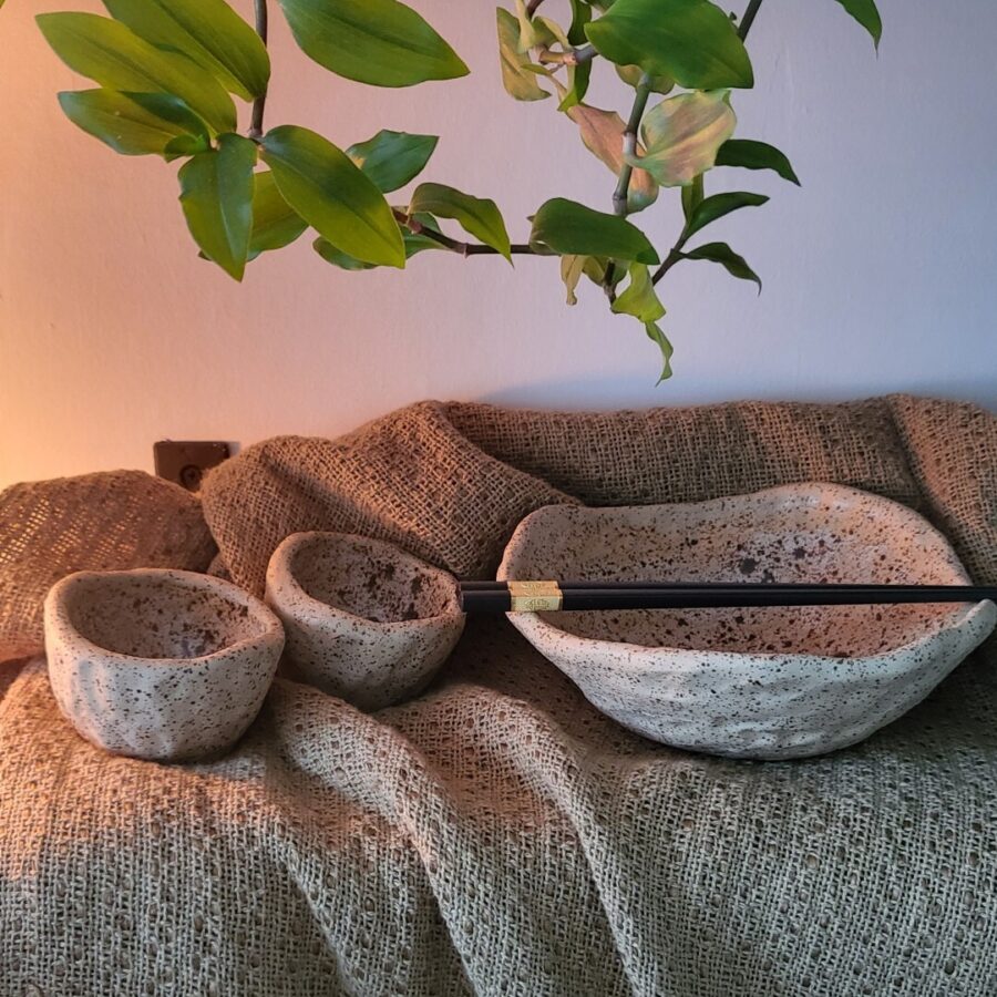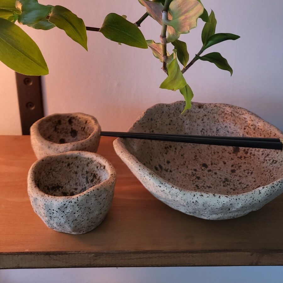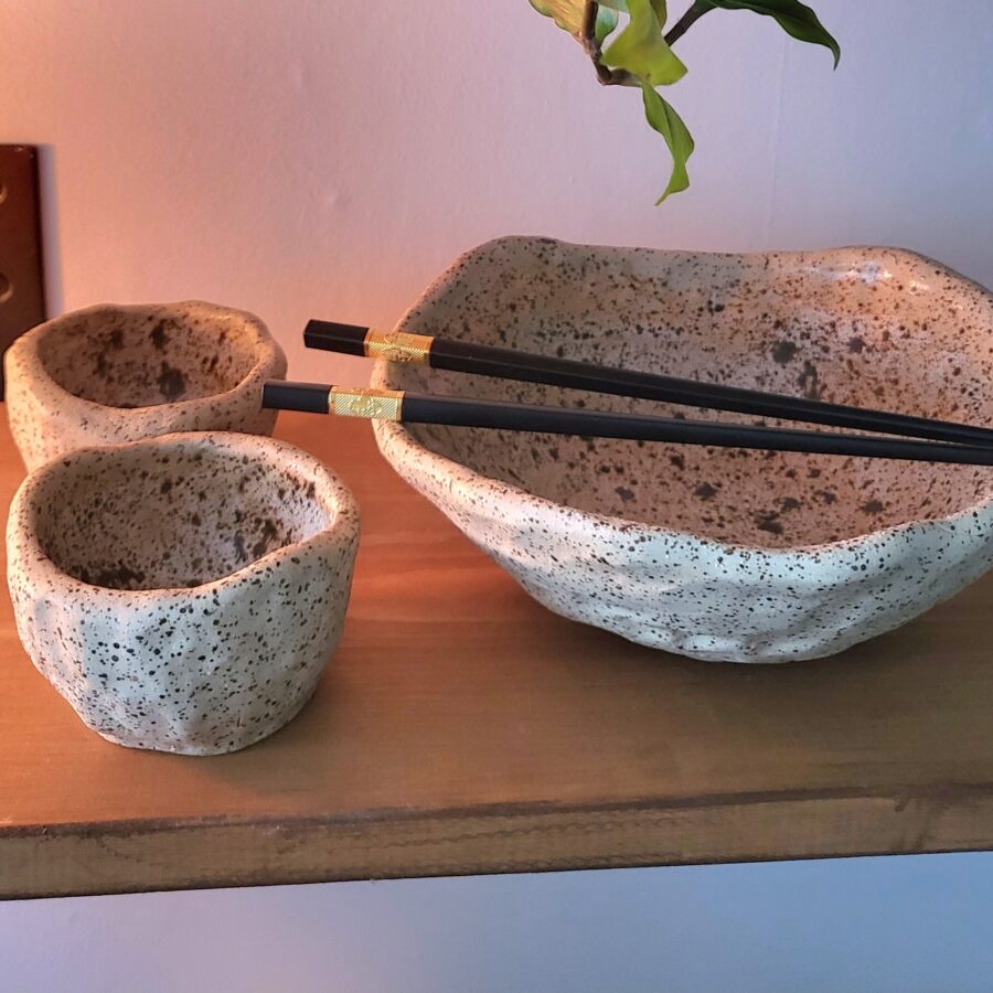 A beautiful speckled stone hand built noodle bowl with two little Saki/dipping pots.