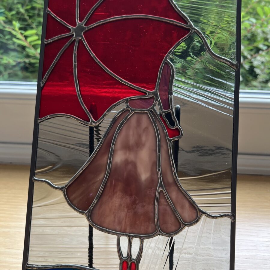 A stunning stained glass panel featuring a lady in the rain. Handmade with stained glass. Supplied with display stand