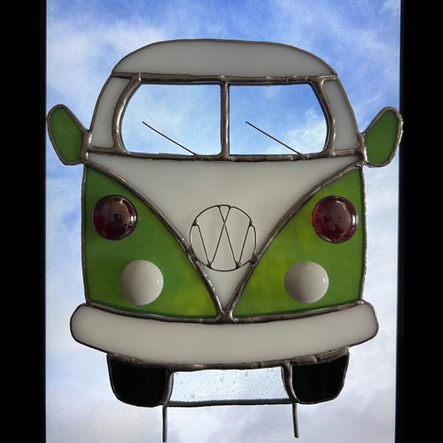 A stained glass VW Camper sitting on a rock. Choose your own colour combination (subject to glass availability) simply add to the comment box on ordering.