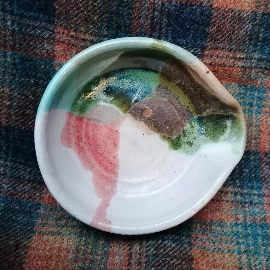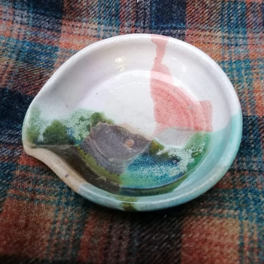 A small stoneware spoon rest in bright colours. Hand thrown on the wheel. Food safe. Dishwasher and microwave safe.