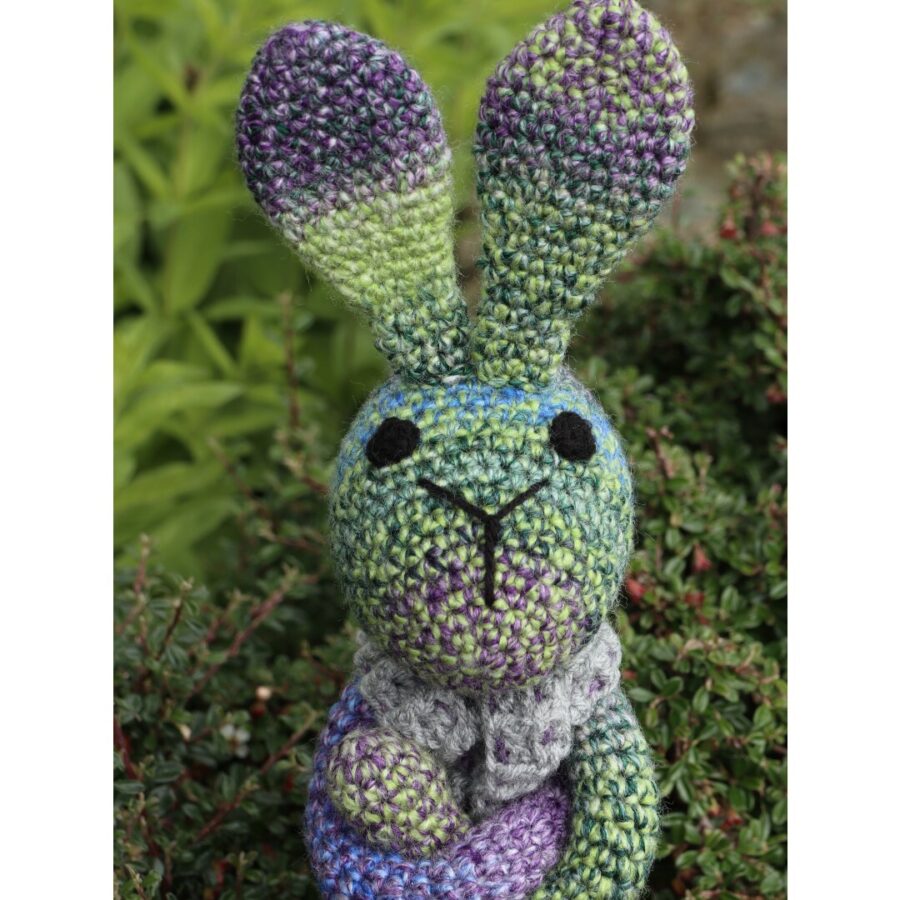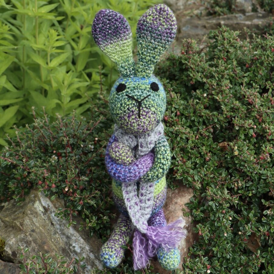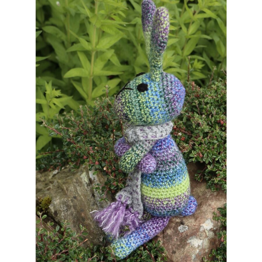 “Struan” means "small stream". Struan is crochet in a lovely variegated blue/green acrylic yarn, has crochet black eyes and wears a long scarf. Each bunny is unique in name as well as colours. Struan is 45cm tall and can sit upright by himself. This would be a lovely gift for anyone between 0-100.