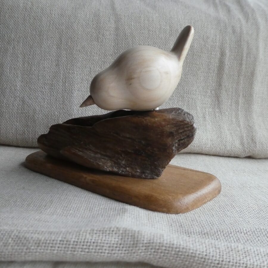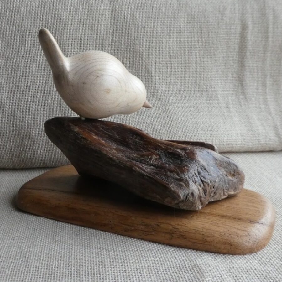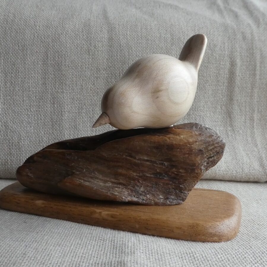 A beautiful and unique hand crafted wren style bird. The bird is turned from sycamore wood, mounted on a piece of driftwood and wooden base.